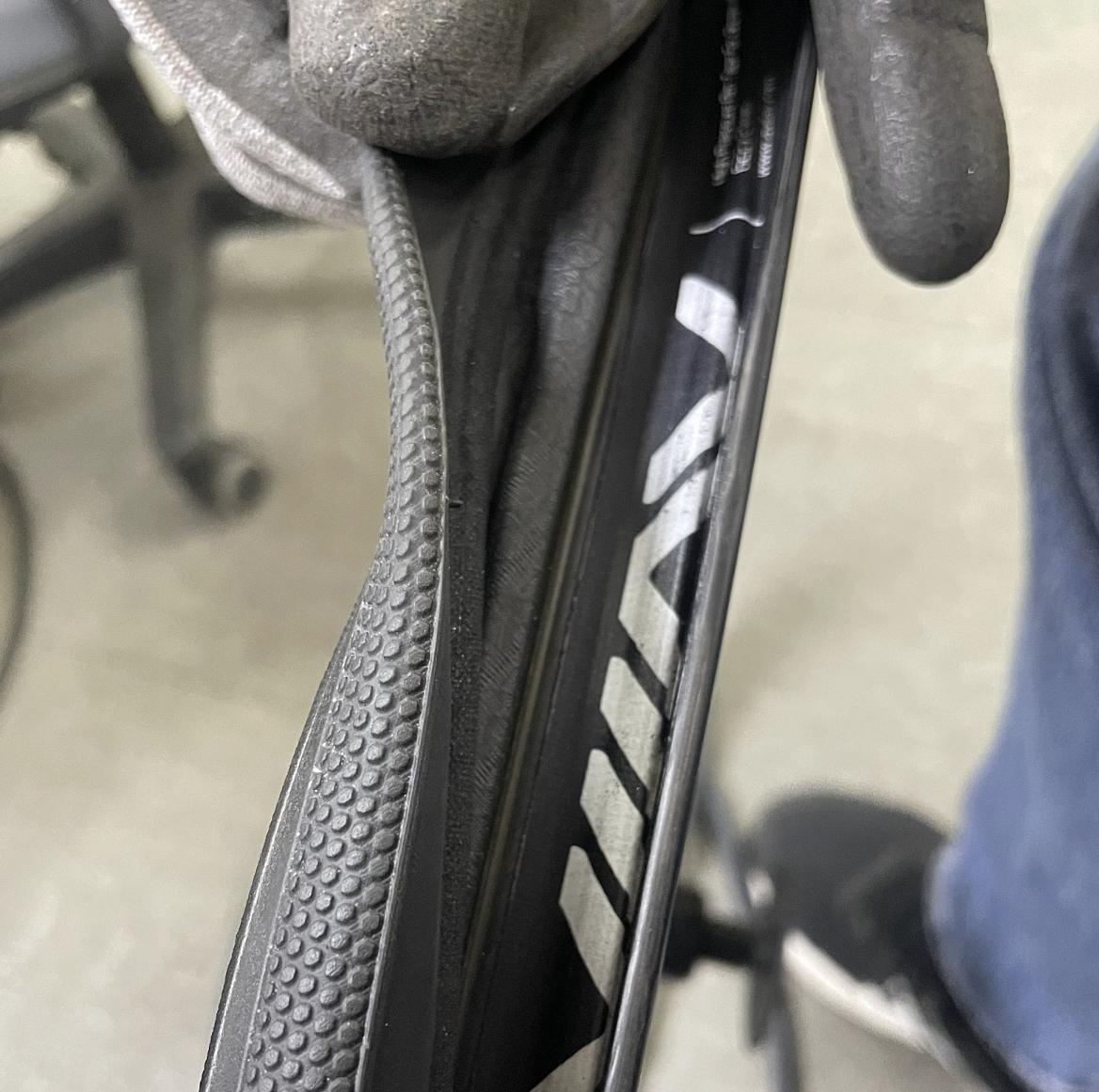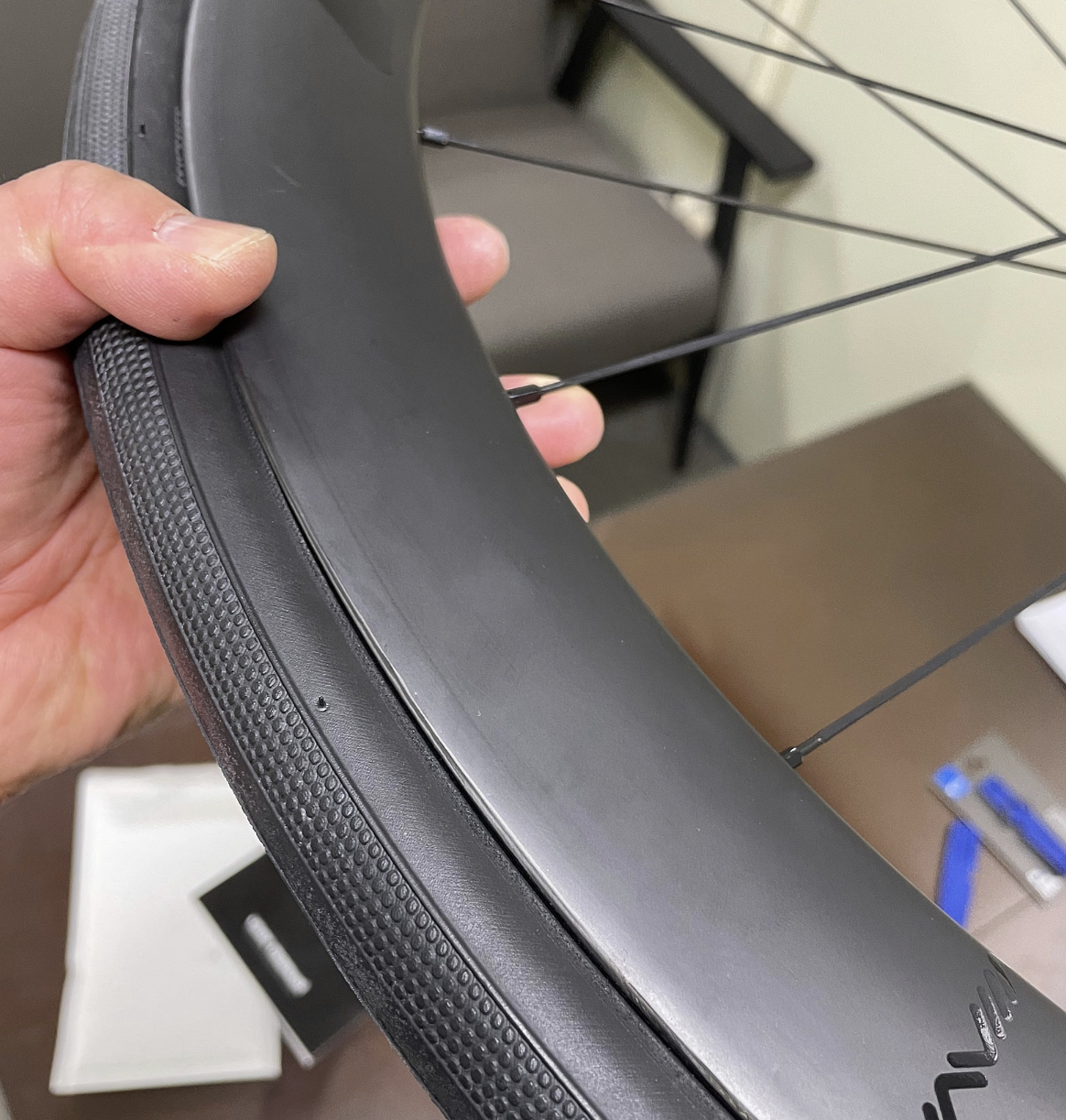 - 바람을 90psi 정도 넣고 타이어를 세워 돌려보니 삐뚤삐뚤 돌아갑니다. 비드 안착이 제대로 되지 않은 것이죠.
