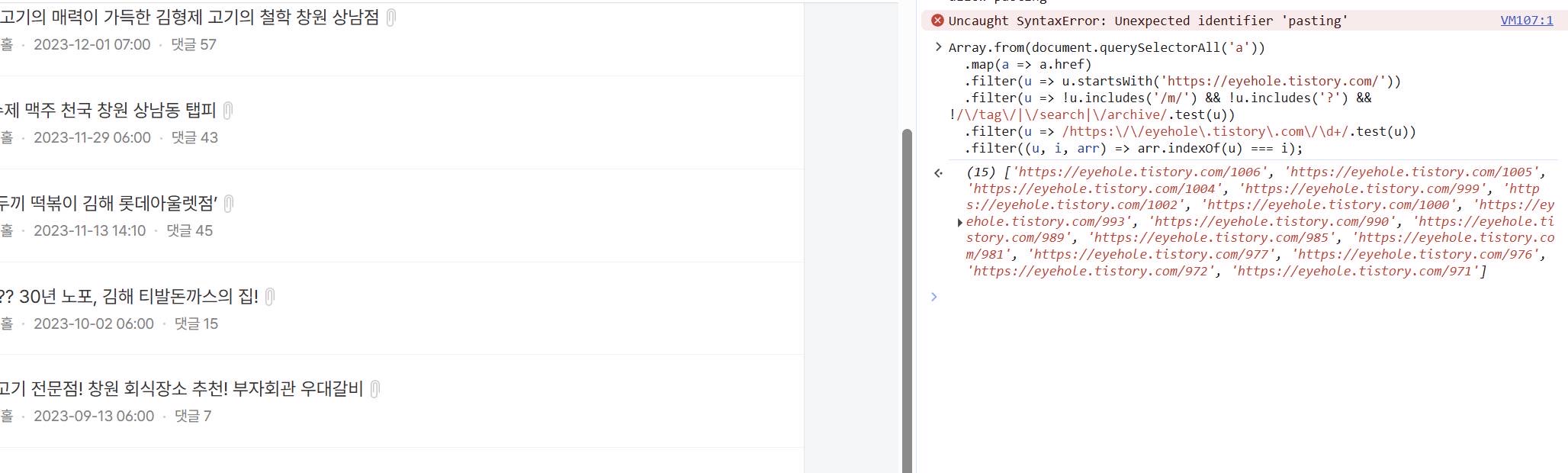 - 무한 스크롤이면 맨 아래까지 스크롤해 모든 글이 로딩된 상태에서 실행하세요.