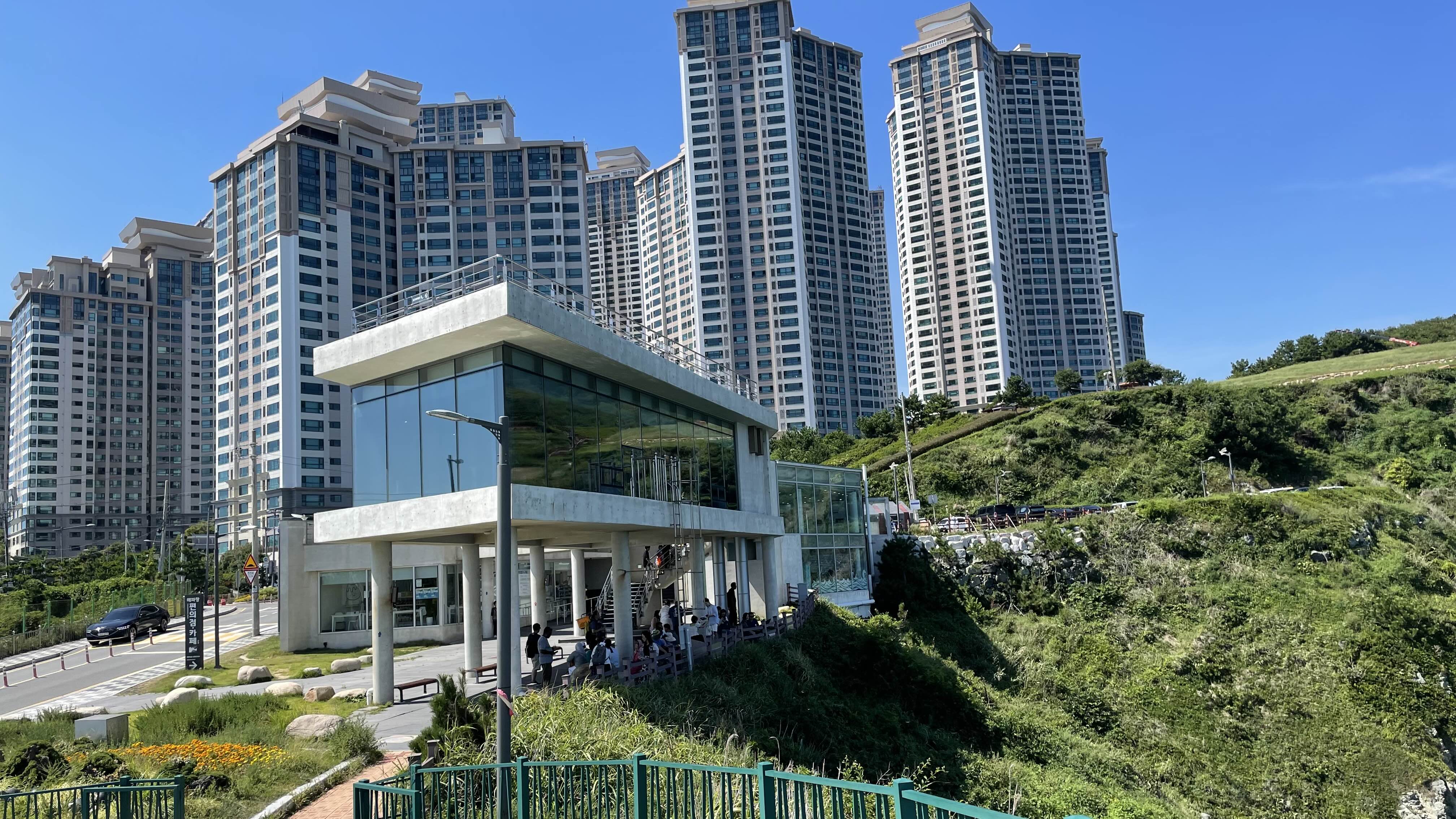 스카이워크에서 주차장으로 돌아오는 길에는 편의점, 휴게 공간, 그리고 ‘해파랑카페’가 자리해 쉬기 좋았습니다. 그 뒤로는 아파트 단지가 보였는데, 매일 저렇게 탁 트인 바다 풍경을 집에서 바라볼 수 있는 삶이 부럽기도 하고, 한편으로는 씁쓸한 기분도 들더군요. 그렇지만 그런 환경 속에서 삶을 누리는 이들의 여유가 또 얼마나 소중할지 생각해보게 됩니다.