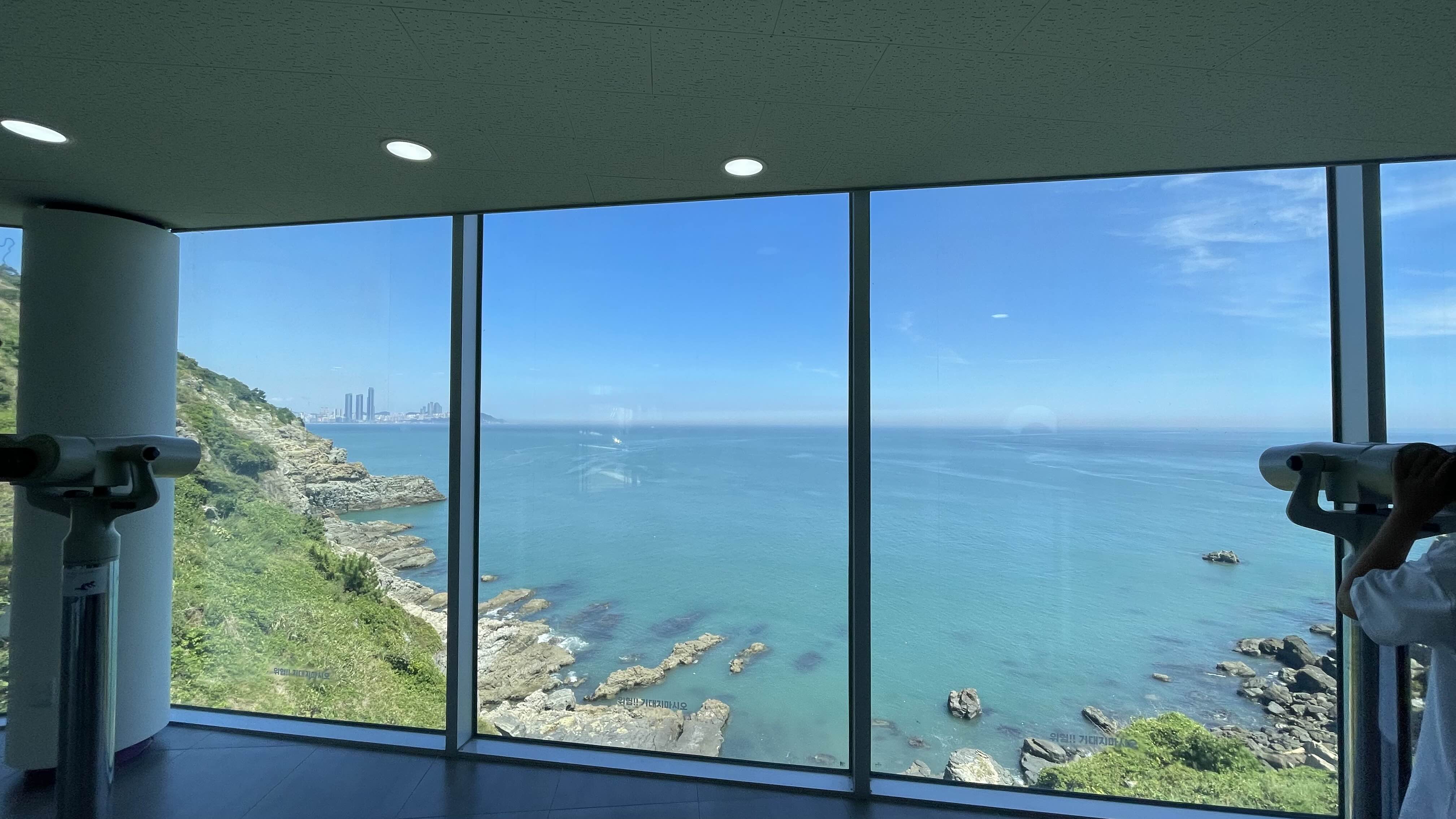 주차장 바로 앞의 휴게 공간도 참 좋았습니다. 공간 안쪽은 벽면을 가득 채운 유리창으로 바다가 한눈에 들어오고, 멀리 부산 시가지도 보였어요. 잠시 휴식을 취하며 자연을 편안하게 느끼기에 최적의 장소였습니다.