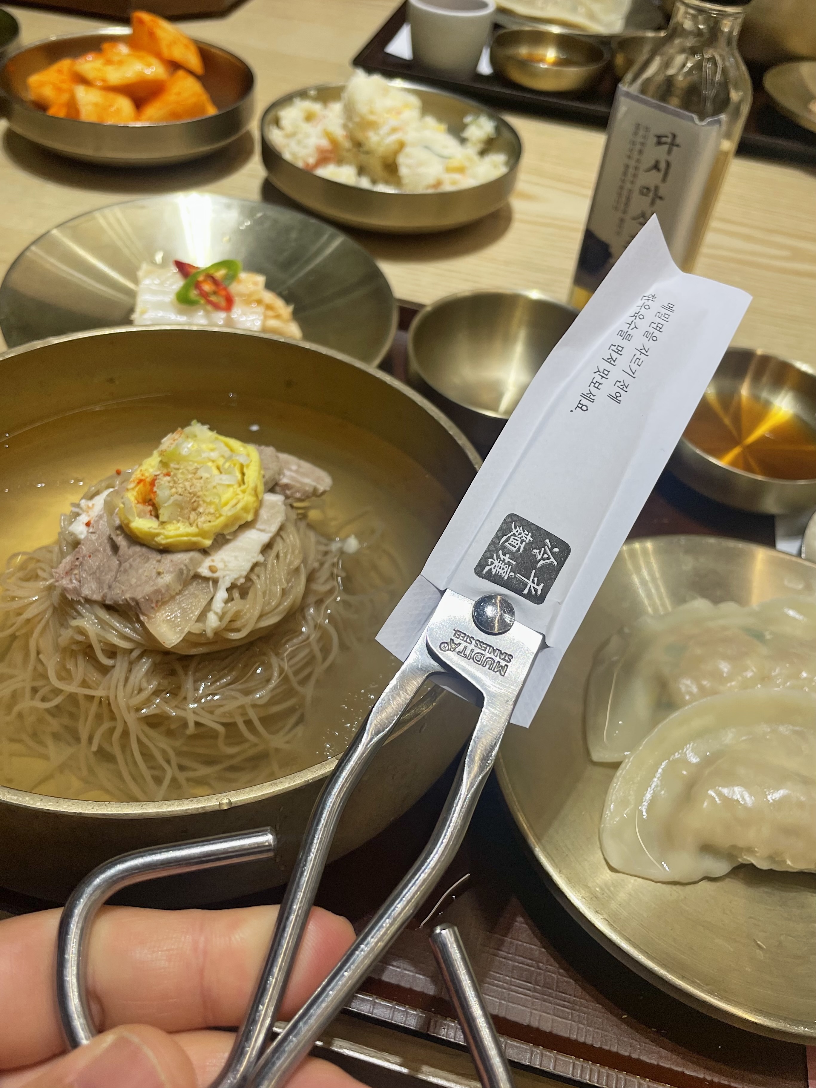 성산옥에서 평양냉면과 어복탕을 시켰는데, 냉면은 육수가 담백하고 깔끔해 자꾸 생각나는 맛이었어요. 만두도 속이 꽉 차서 식감이 좋았고, 전통 유기그릇에 정성스럽게 담겨 나와서 음식 하나하나에 고급스러운 느낌이 가득했답니다.