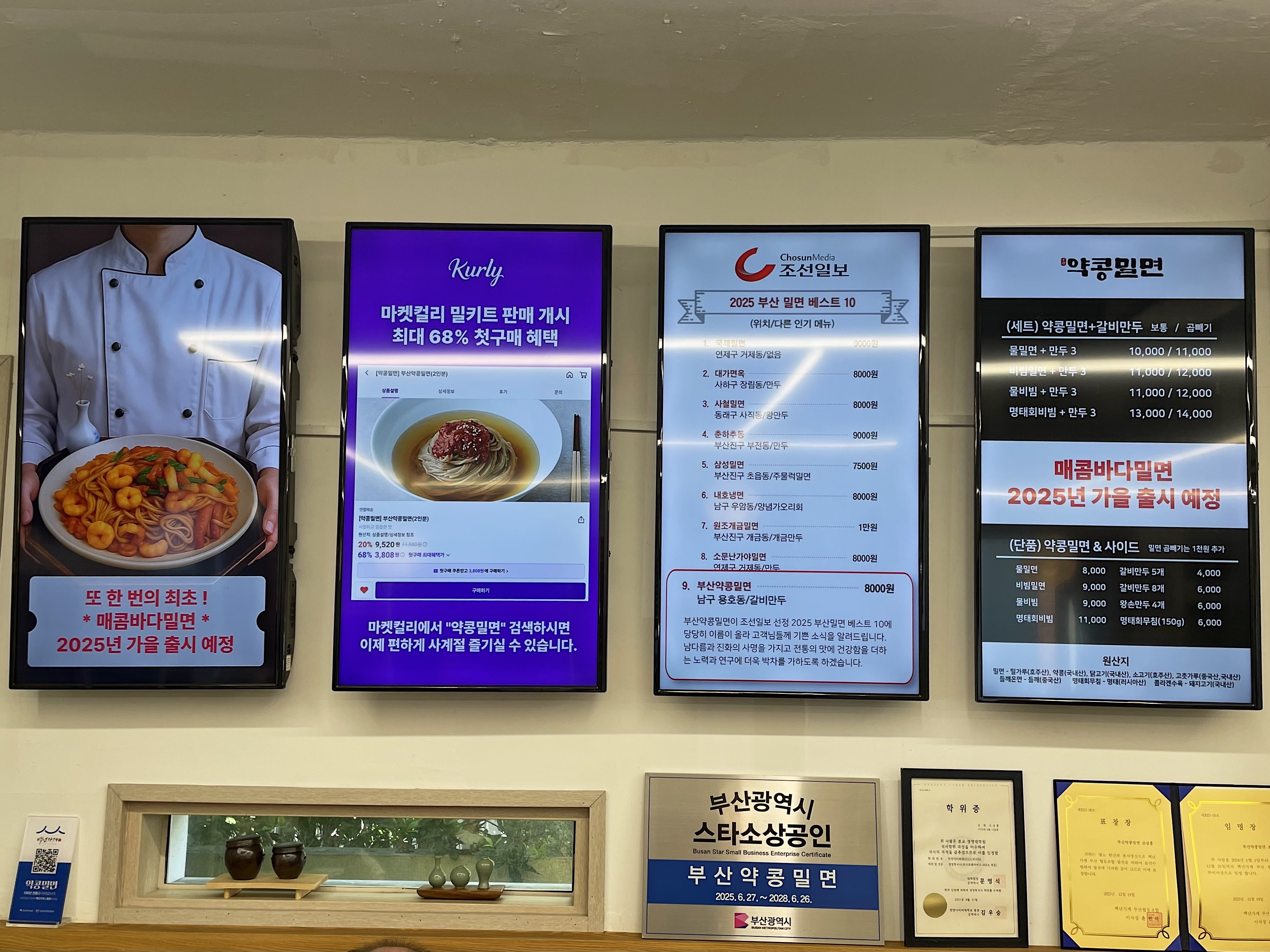 벽에 붙은 블루리본서베이 4년 연속 수상 스티커와 부산 10대 밀면 선정, 마켓컬리 밀키트 판매 소식 등 전통과 명성은 분명하지만, 이날 저희는 간이 조금 과했던 경험을 했습니다.
