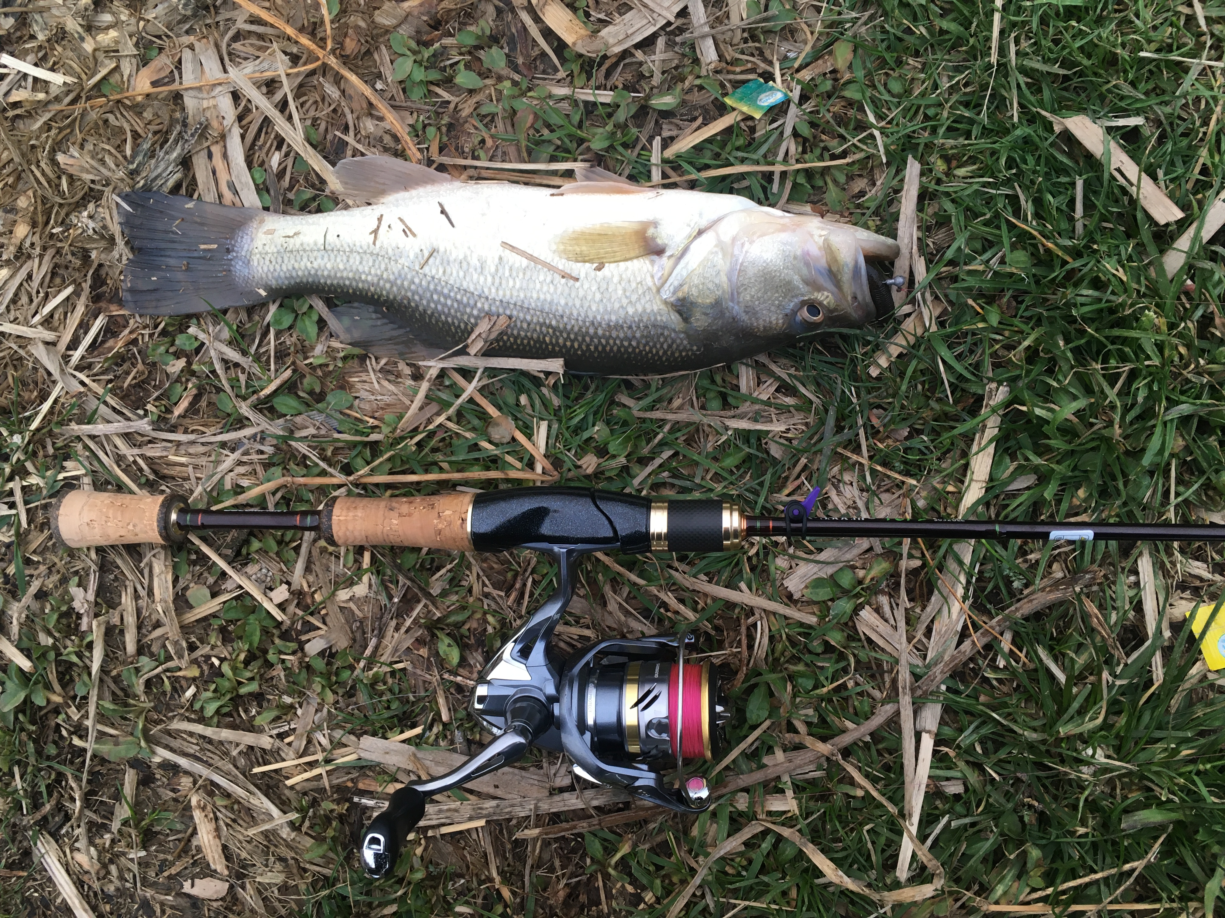 발 앞 수초 부근에서 토톡하는 약한 입질 후 잠시 스테이를 주니 라인이 옆으로 흐르길래 힘차게 훅셋하였습니다.