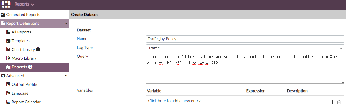 select from_dtime(dtime) as timestamp,vd,srcip,srcport,dstip,dstport,action,policyid from $log where vd='EXT_FW' and policyid='258'