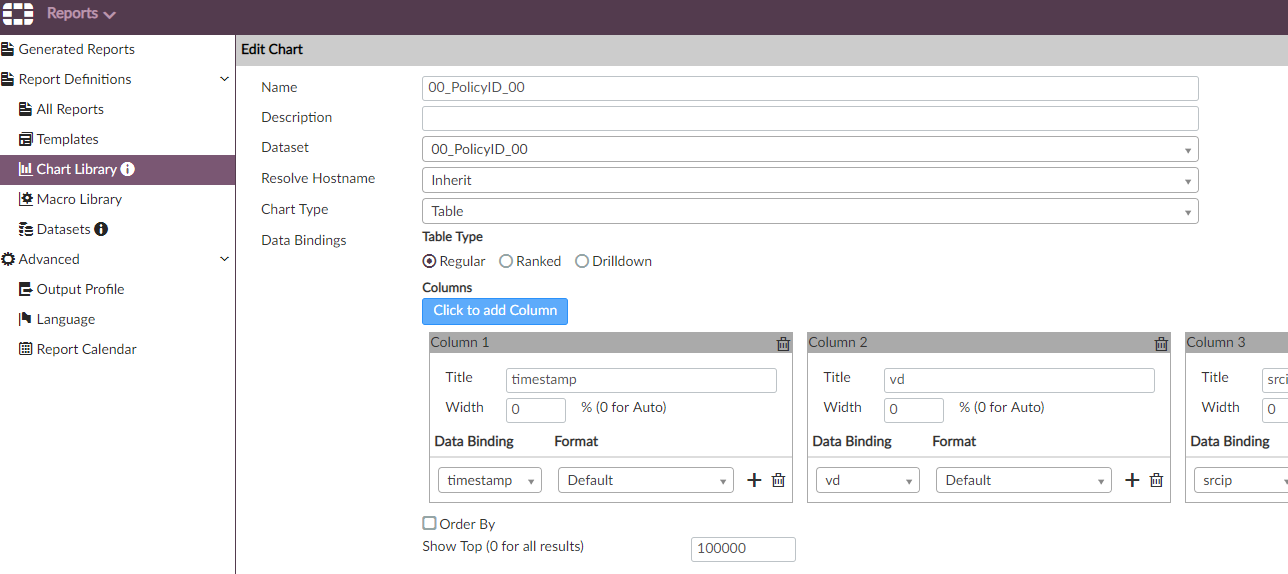 Name 입력 및 앞서 생성한 Dataset 선택, Chart Type 은 Table , Click to add Column 버튼을 통해 필요한 열을 추가