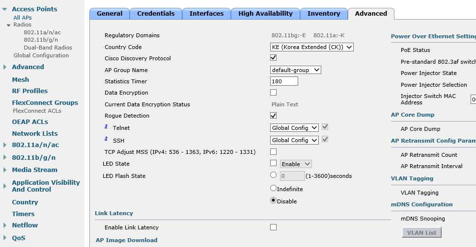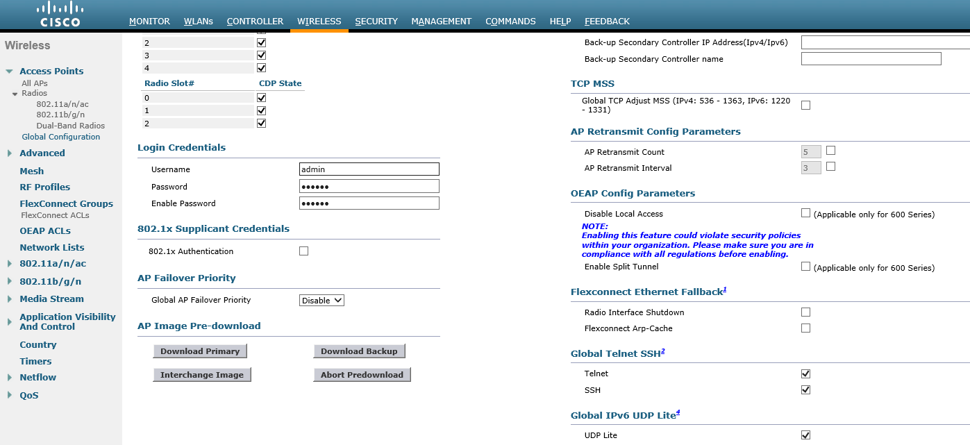 해당 AP 선택 후 Advanced Tab 에서 Telnet, SSH 를 Global Config 가 아닌 AP Specific 으로 설정