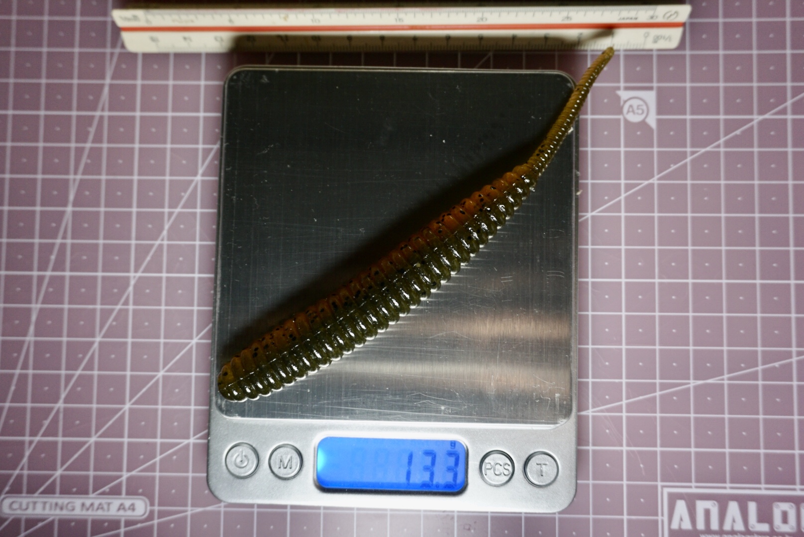 생김새는 통통한 몸통에 울퉁불퉁한 요철이 있으며, 급격히 가늘어지는 꼬리는 진동을 통해 대상어를 유혹합니다.