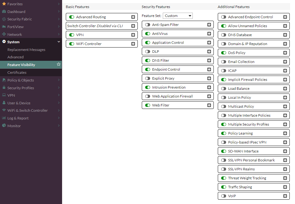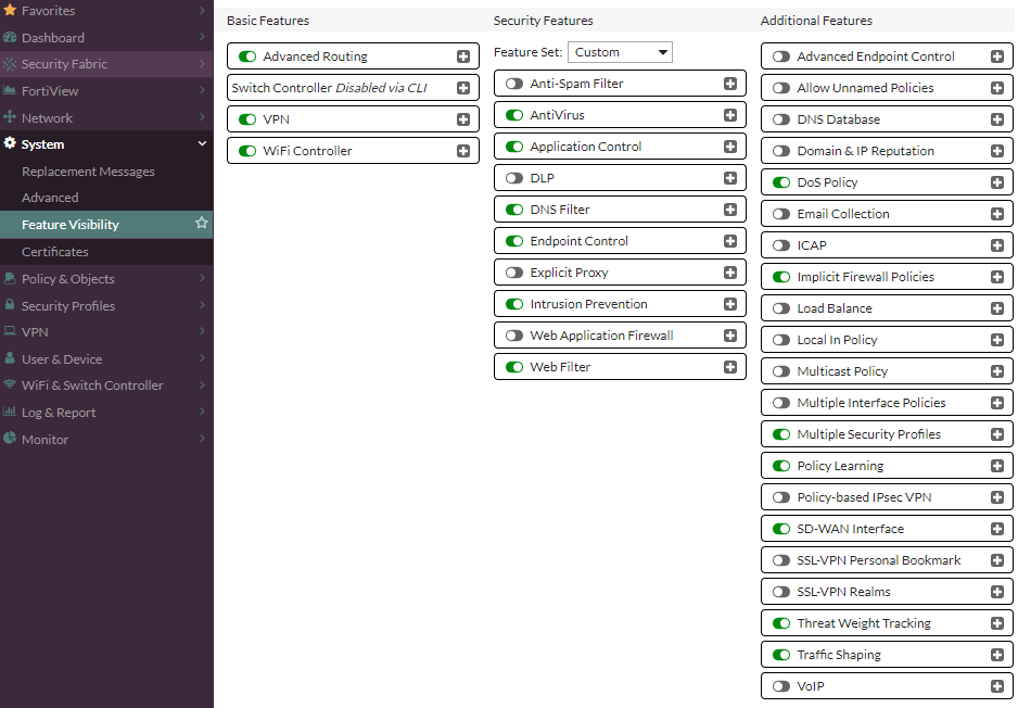 해당 vdom 으로 이동하신 다음 [System]-[Feature Visiblity] 항목으로 이동하신 후