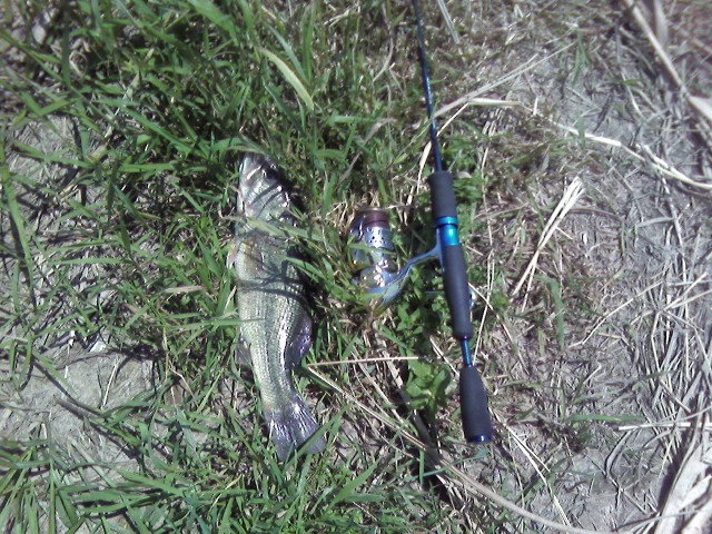 수초에 살짝 걸렸다가 떨어뜨리자 마자, 수면에서 배스 3마리가 튄다.