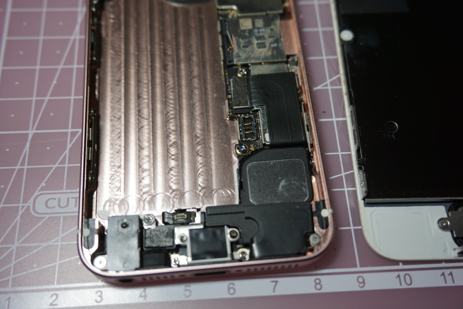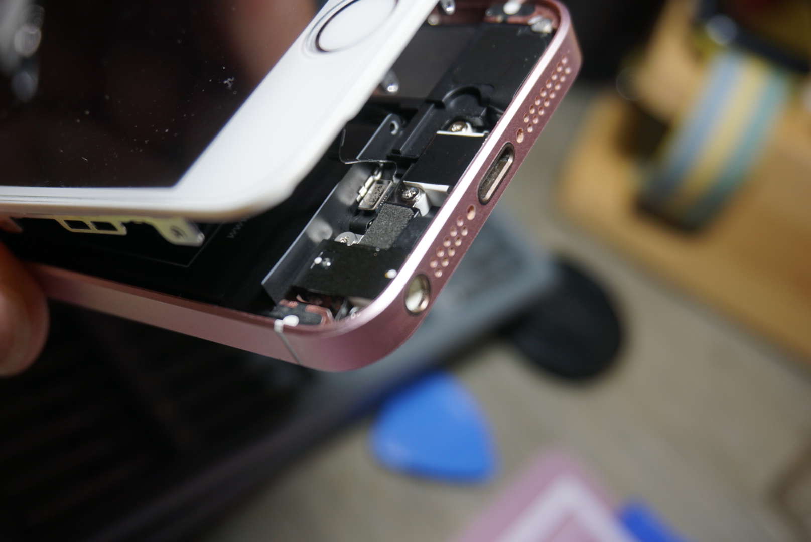아이폰의 하단 충전 단자 양측에 작은 별나사가 위치하고 있습니다.