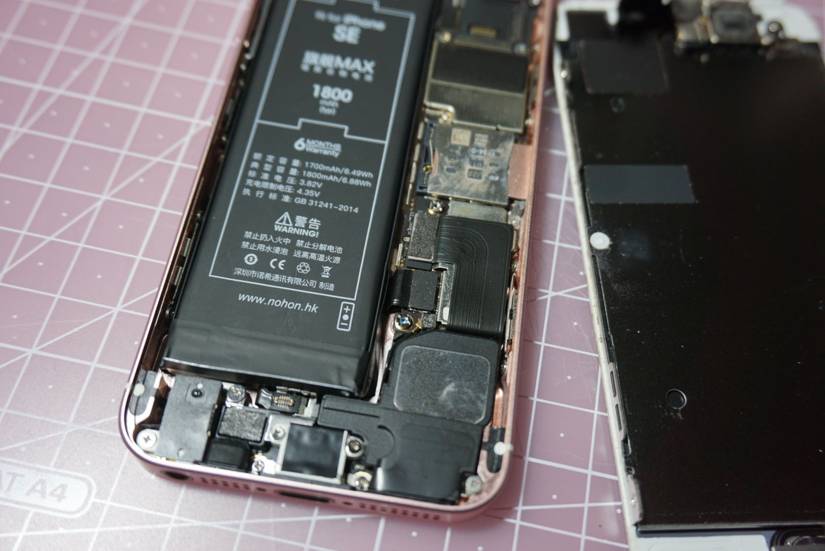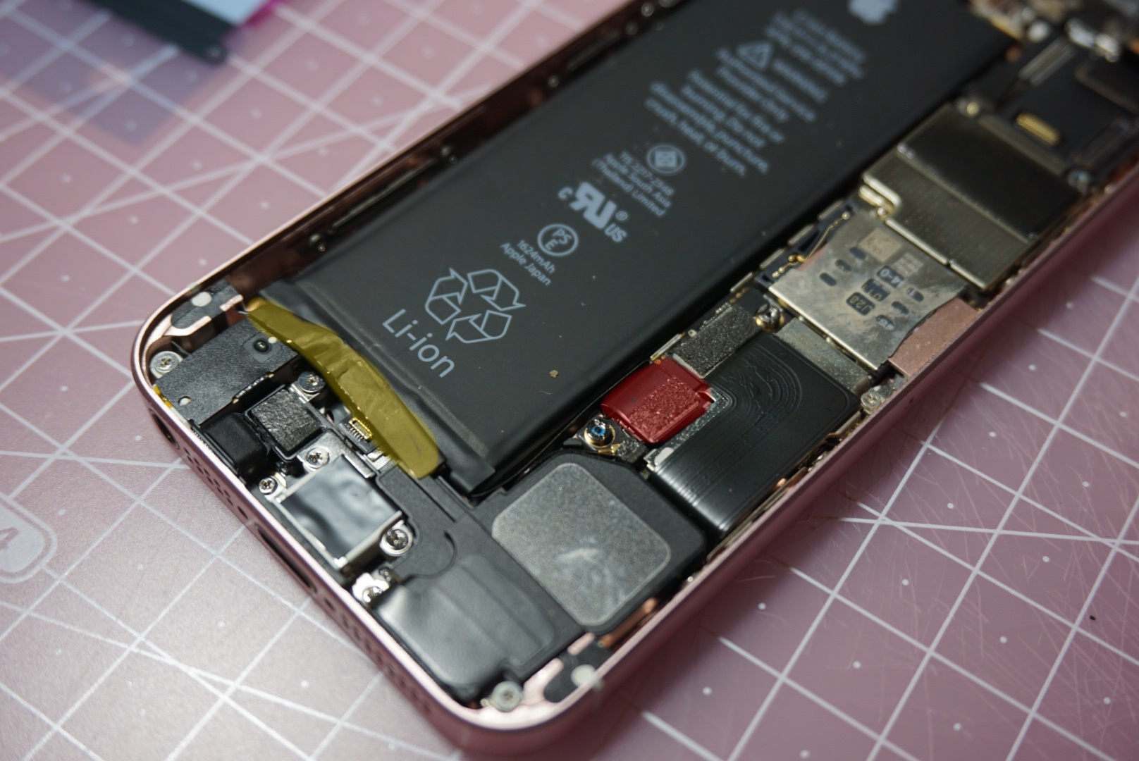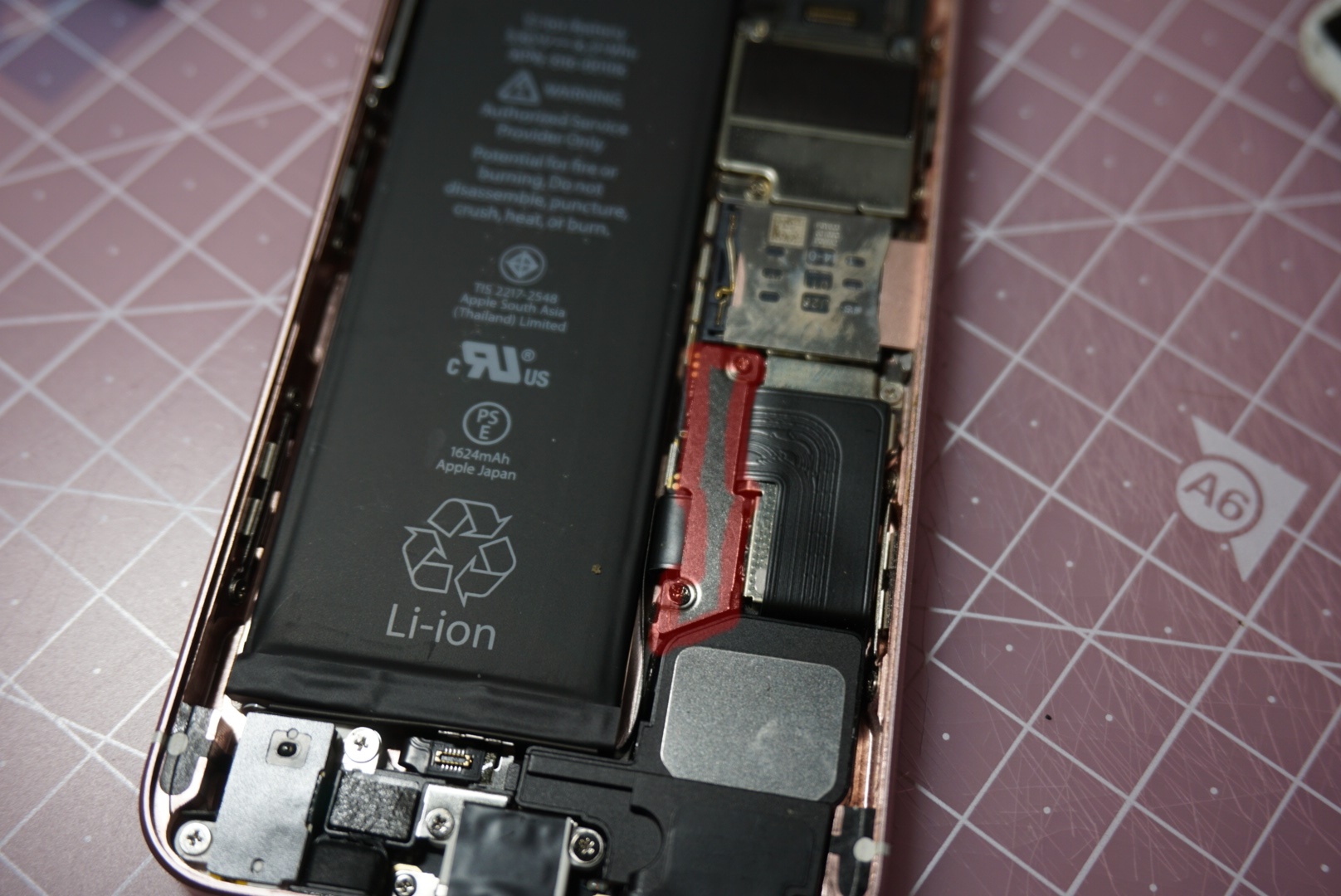배터리는 흔들림 방지를 위해 양면테이프를 이용해 휴대폰의 하판에 견고히 부착되어 있습니다.