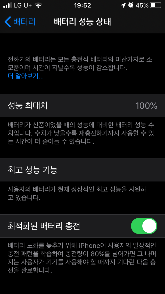 아이폰 설정에서 배터리 성능 상태를 보면 87%이지만, 실제 체감하는 성능은 70% 이하가 아닐까 생각됩니다.