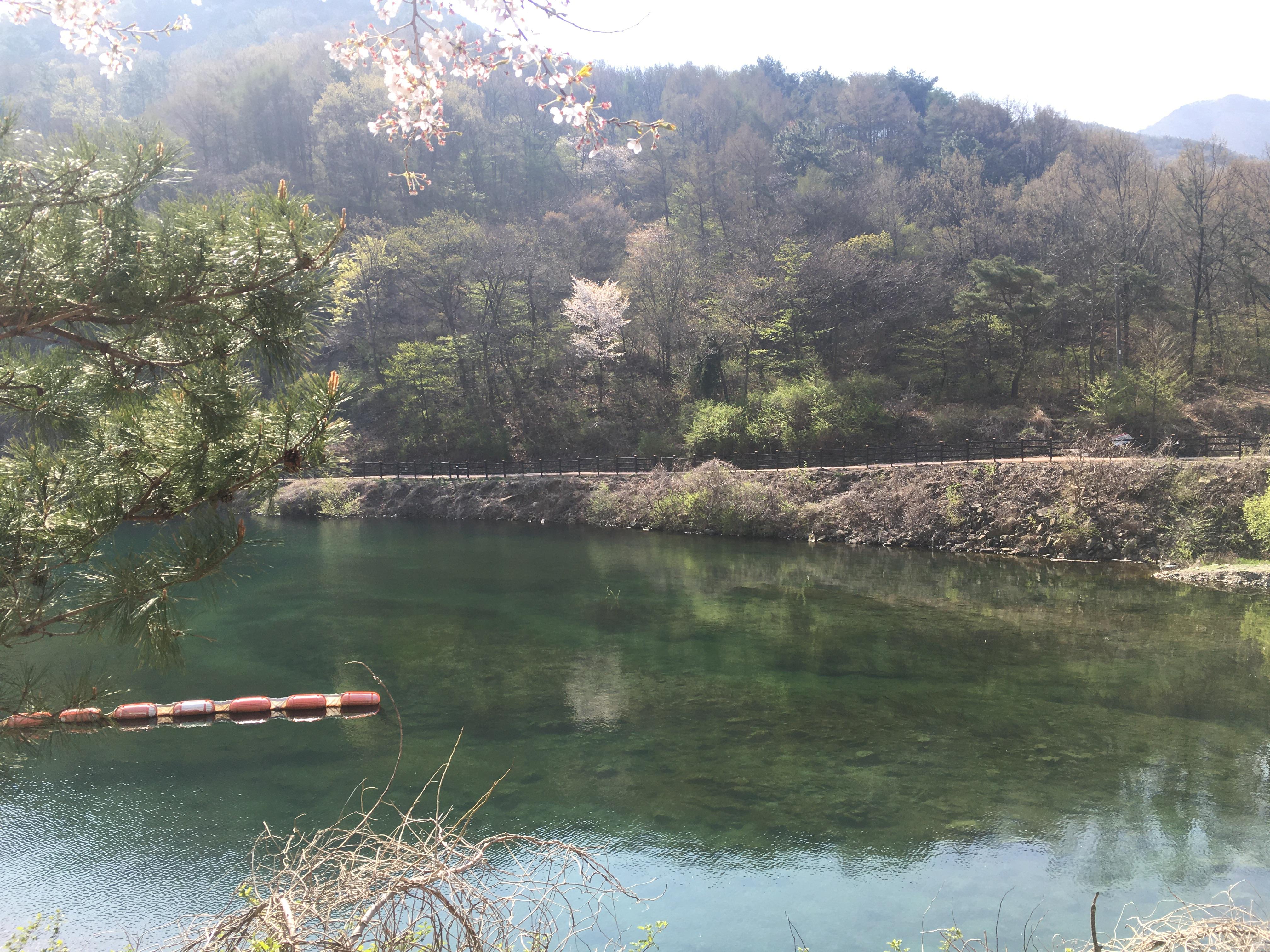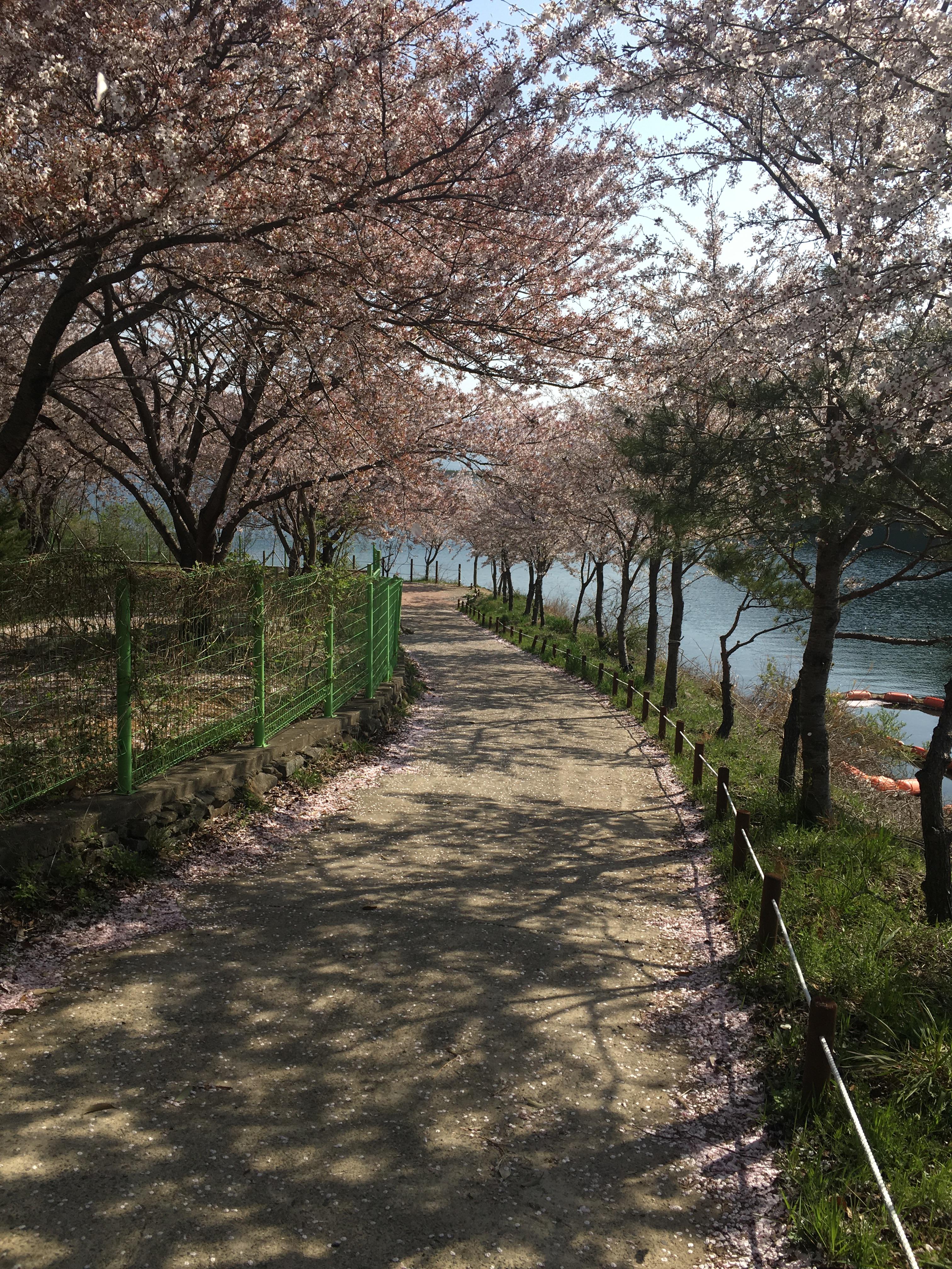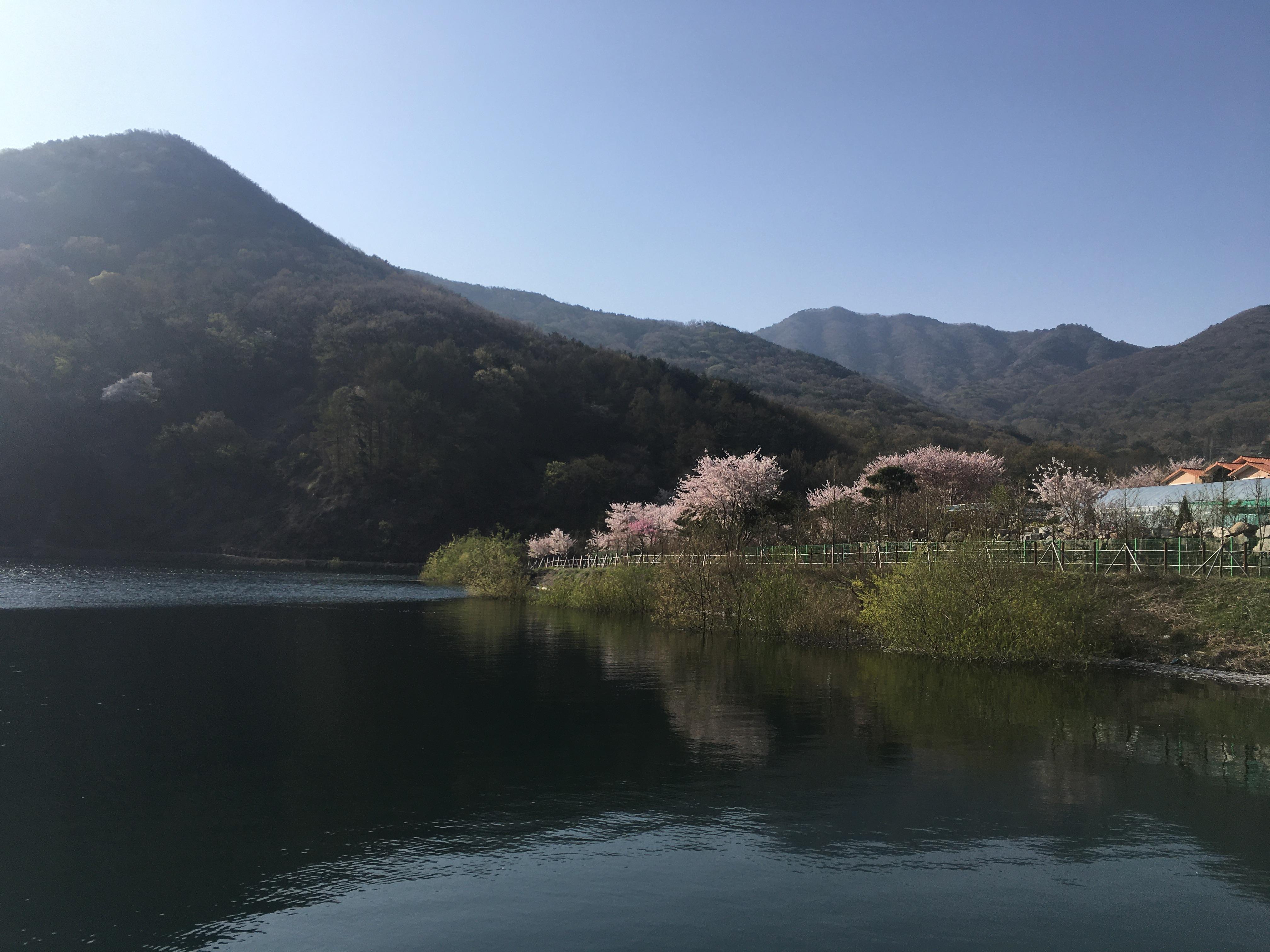 벚꽃은 만발하여 바람에 흩날리고 있었고, 저수지의 물은 작년 가을 태풍 이후 계속 만수위 상태를 유지하고 있습니다.