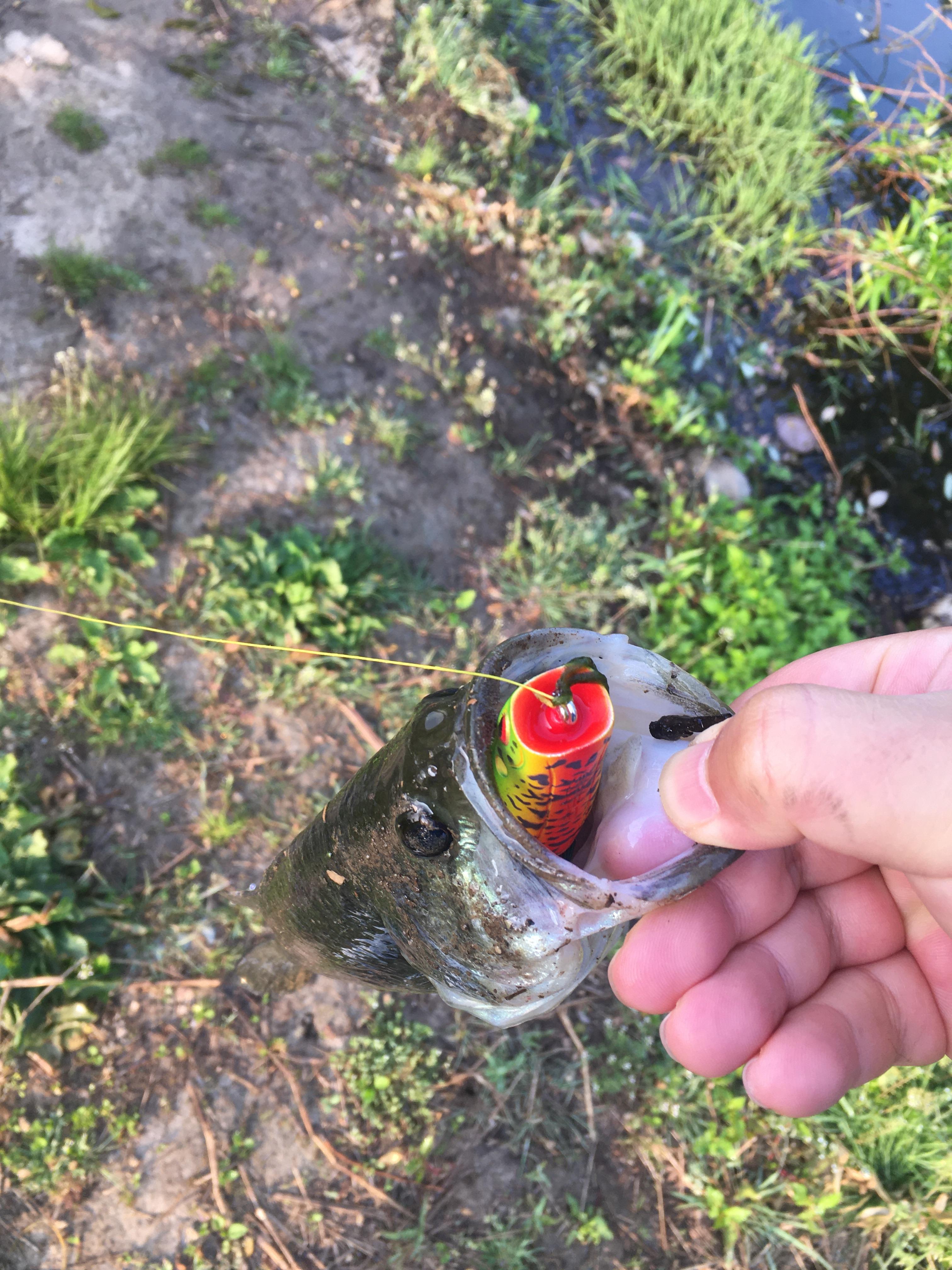 캐스팅 후 수면의 파장이 사라질 때까지 일단 기다렸다 까닥까딱 조금씩 릴링해오다 강하게 로드를 채어 물을 폭! 밀어내자 수면 아래서 배스가 퍽! 하고 덮쳤습니다.