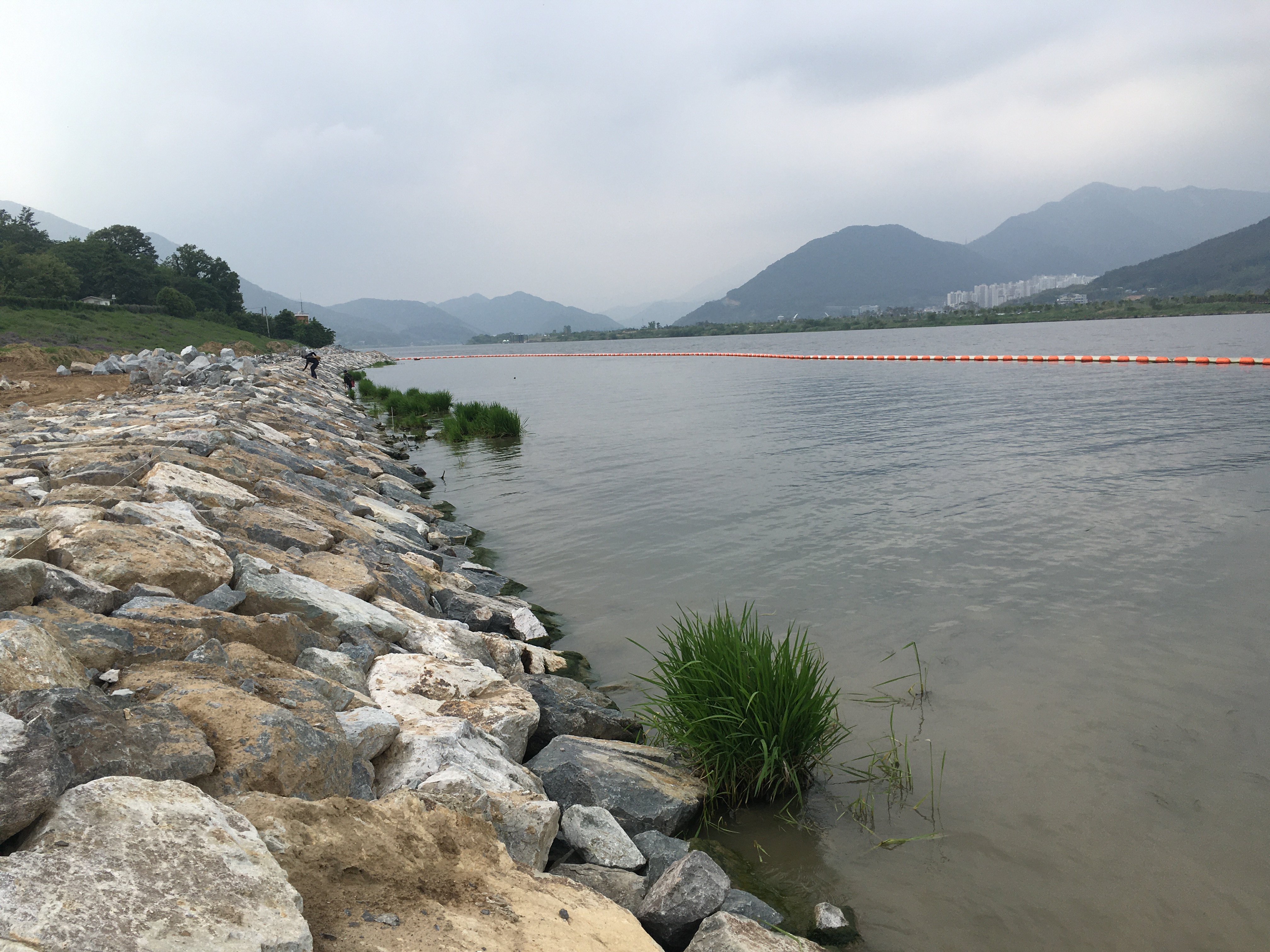 연안에 포크레인으로 석축을 쌓는 공사를 한창 하고 있었으며 바람도 제법 불고 있었습니다.