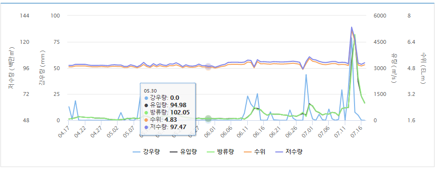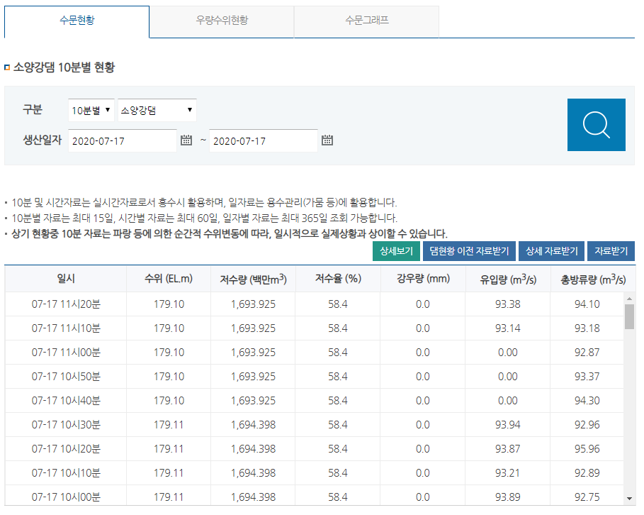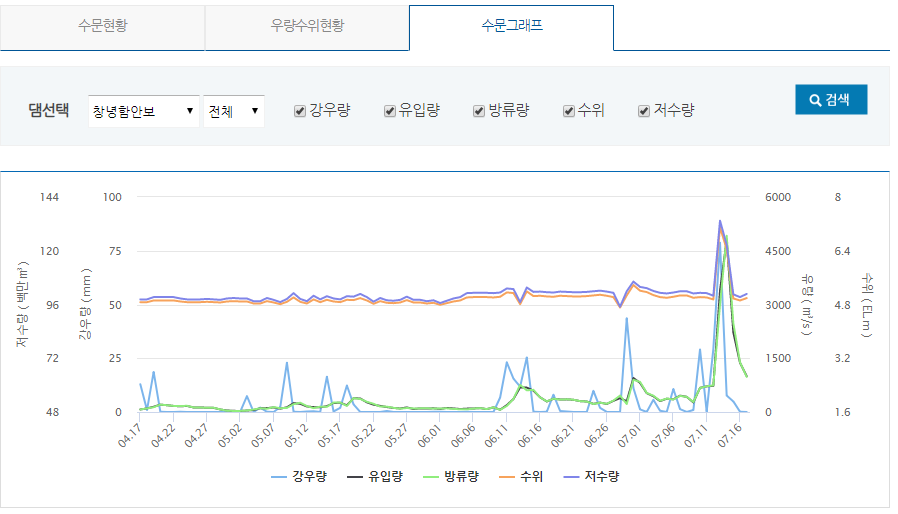 그것보다 상단 [수문 그래프] 탭으로 이동하셔서 보시는 게 직관적으로 확인 가능해 좋더라구요.