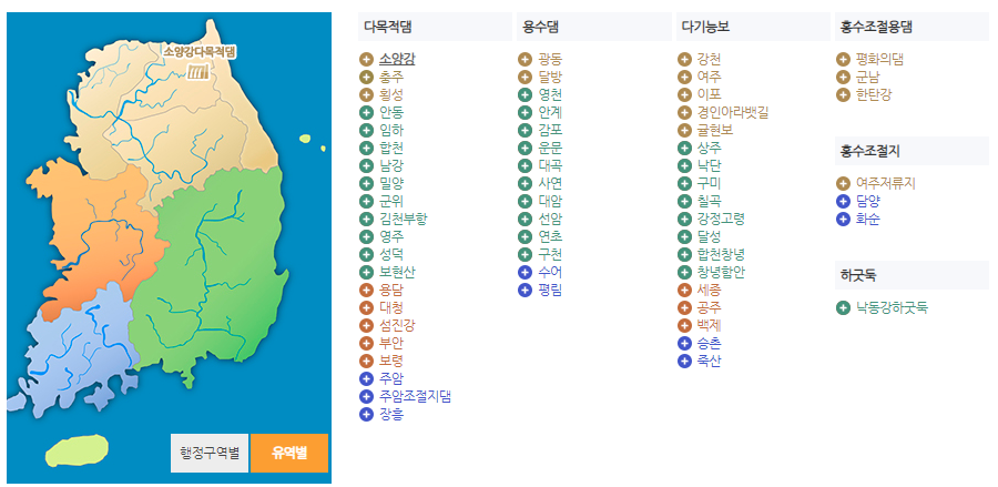 전국에 있는 댐, 보, 하구둑 정보를 볼 수 있으며,
