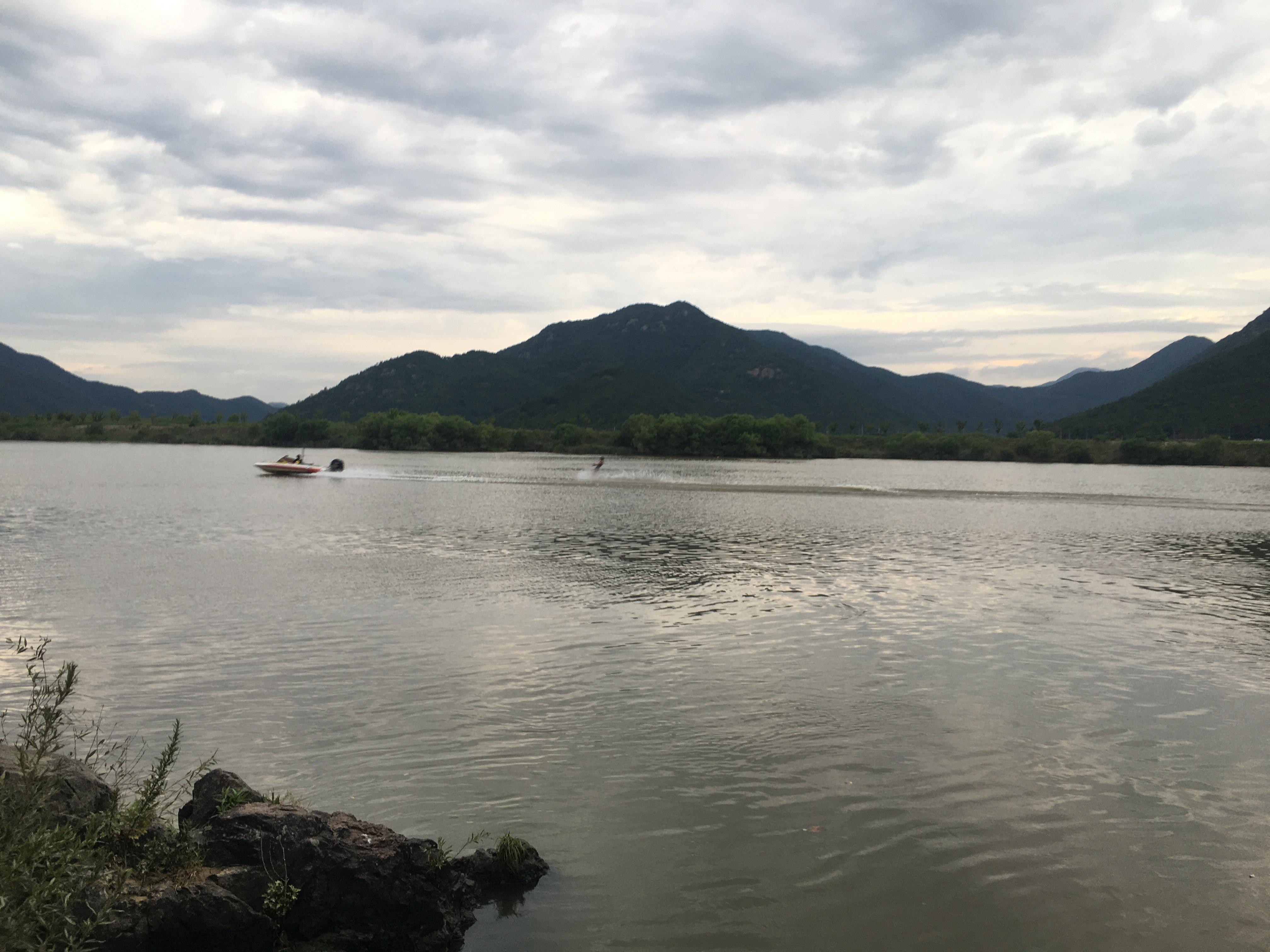 이 흙탕물에도 수상스키를 타고 놀고 있습니다.