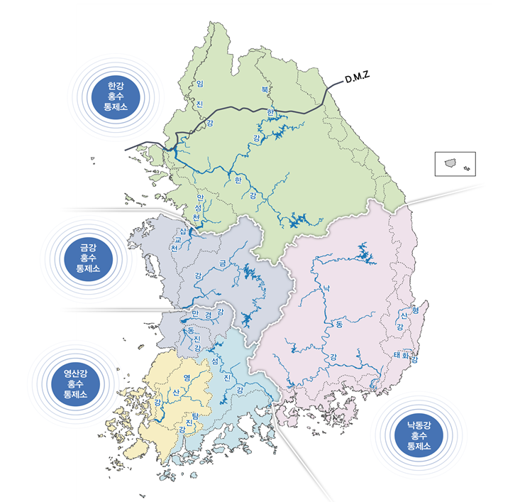 홍수통제소는 환경부에서 관리하는데 각 권역별로 아래 보시는 것처럼 4개의 홍수통제소를 운영하고 있습니다.