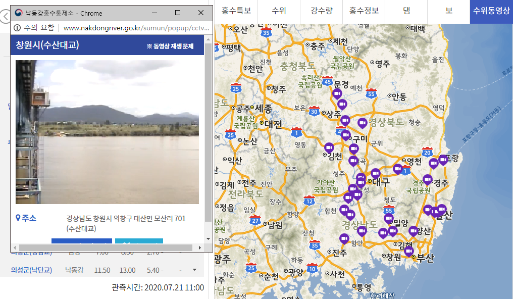 아래 보시는 것처럼 수위동영상 메뉴로 이동하시면 CCTV가 설치된 지역이 아이콘으로 보입니다.