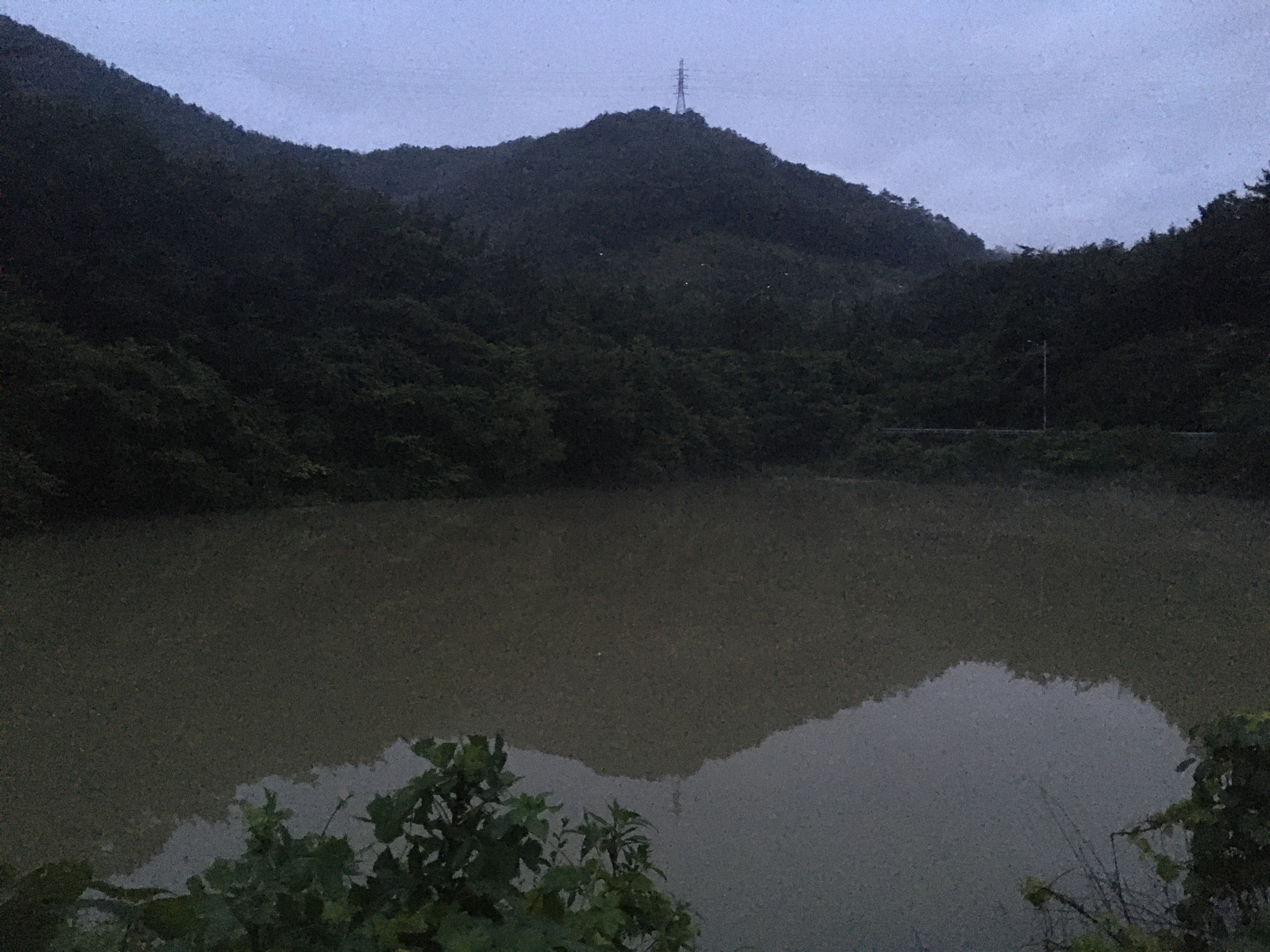 날은 어두워지고 수면에는 물안개가 피어나고 바로 뒷쪽은 산이라 뭔가 으스스합니다.