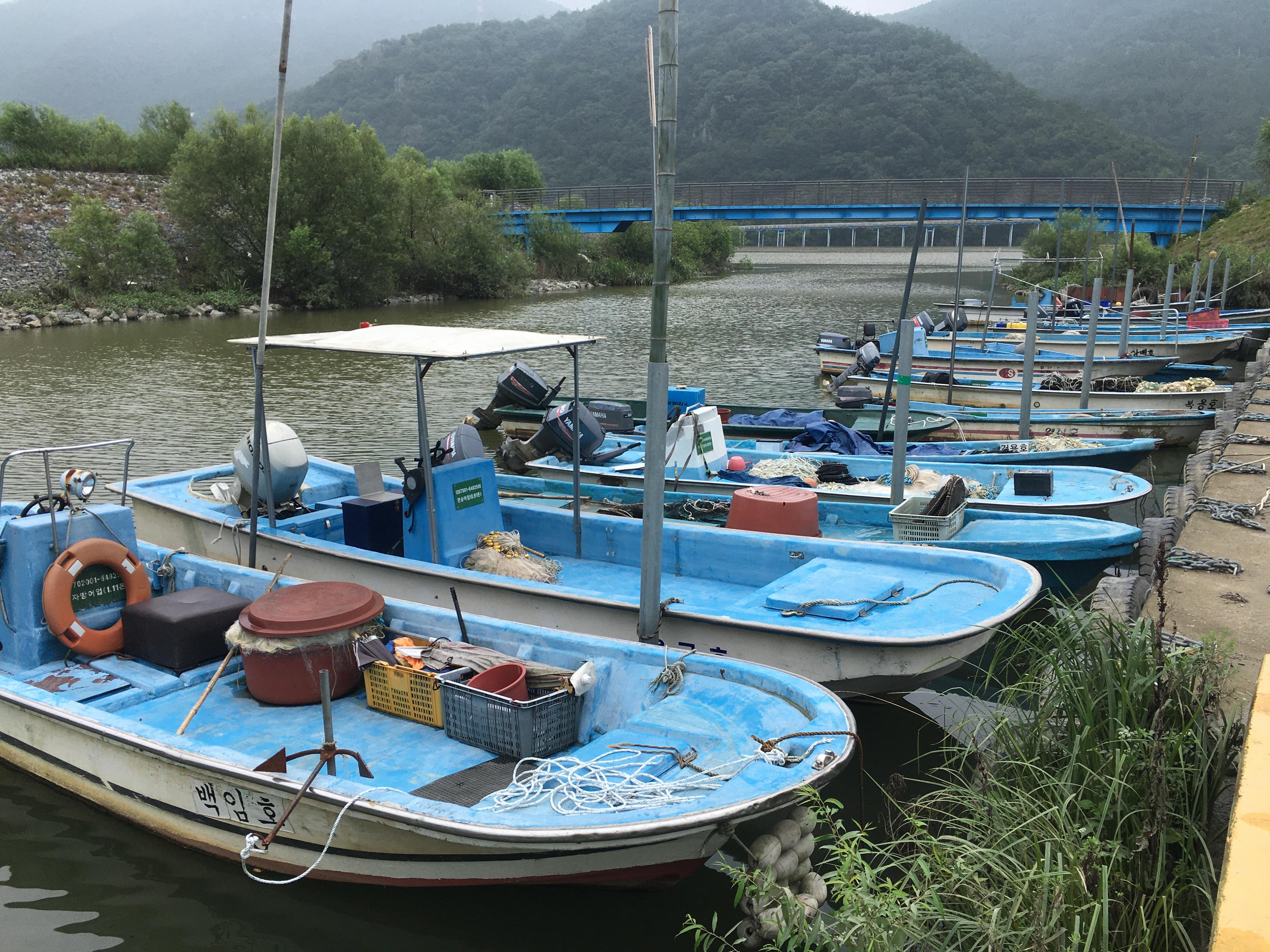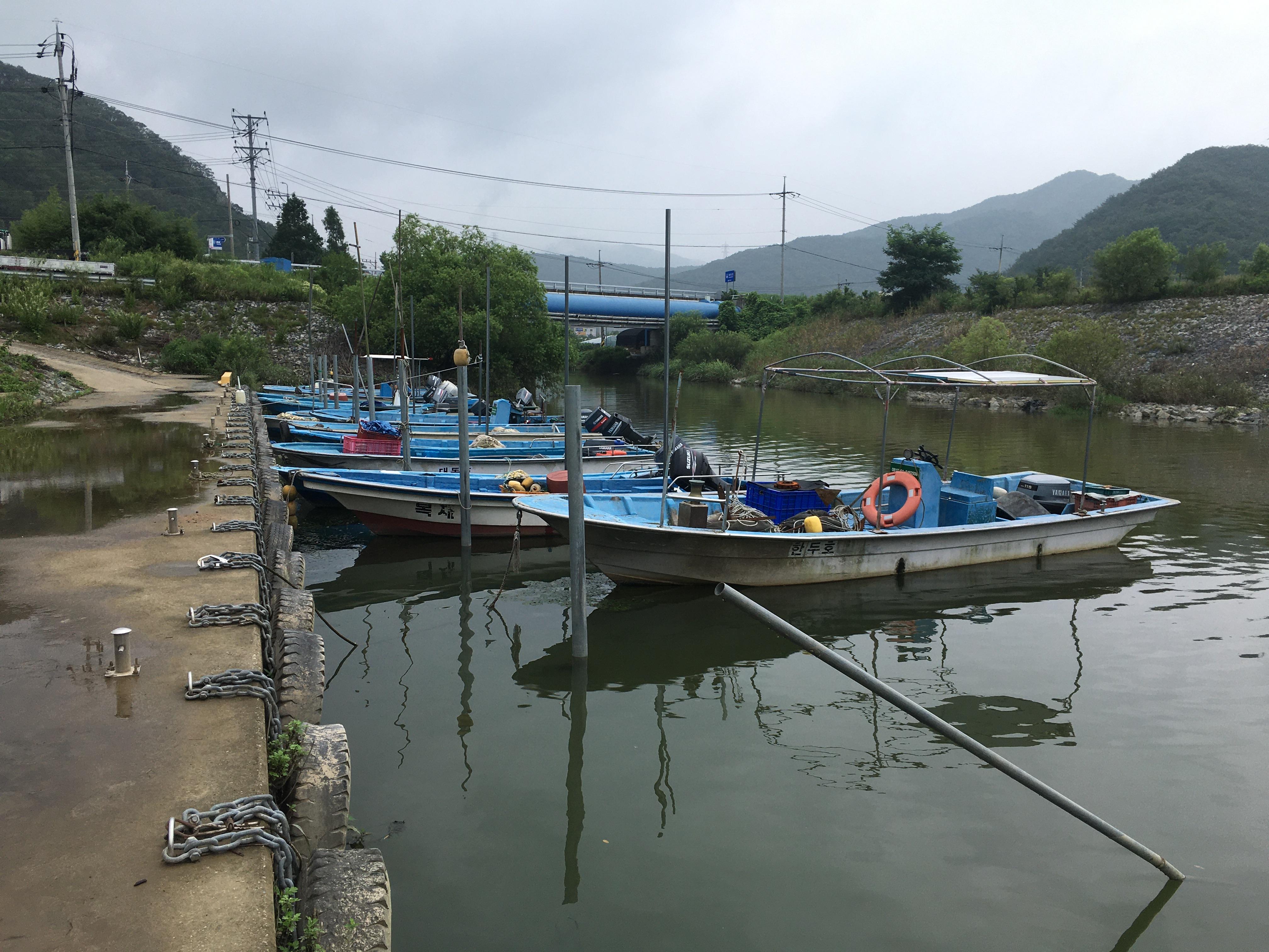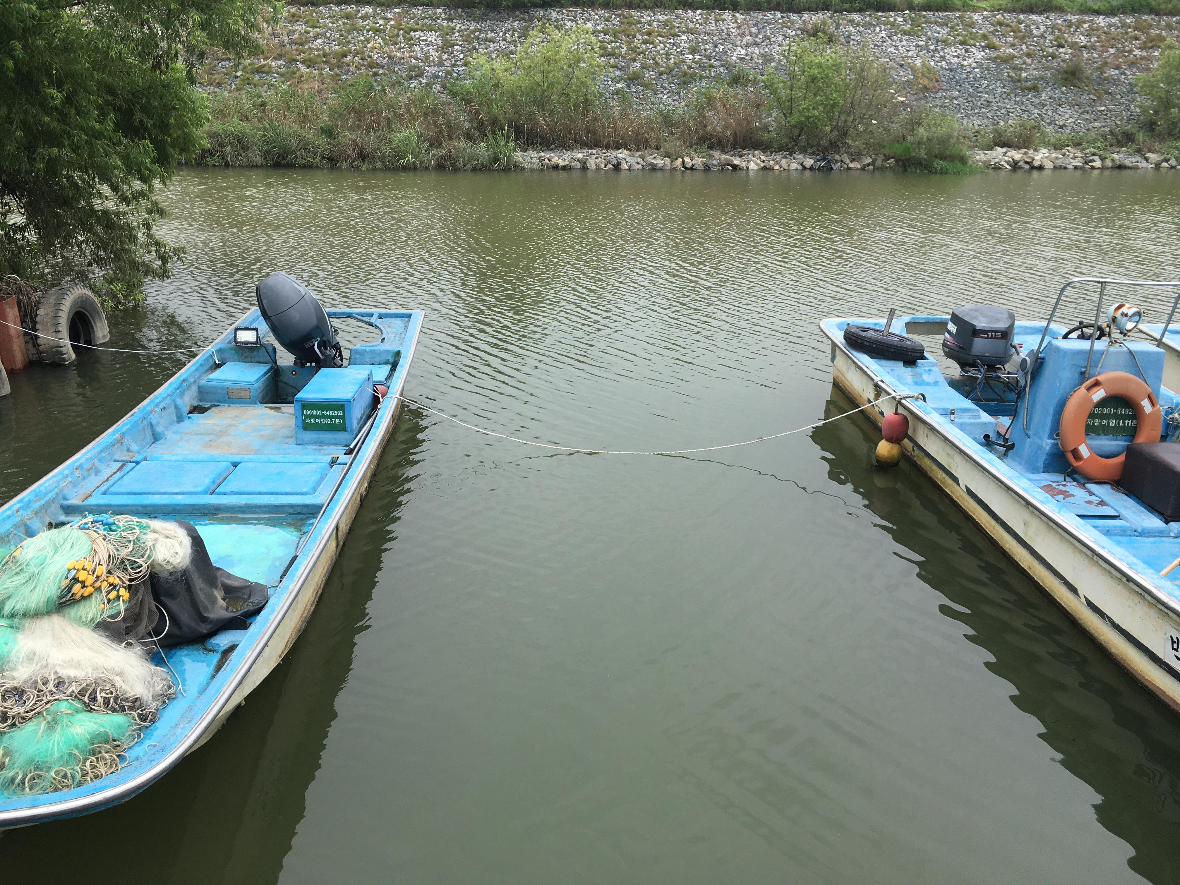 폭우 대비를 위해 어촌계 배들을 밧줄로 묶어놓아 멀리 던지진 못하고