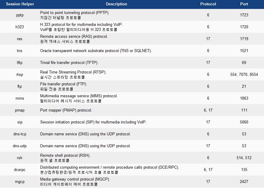 Session-helper 를 통해 SIP, FTP, TNS, TFTP 등 여러가지 설정을 정의할 수 있습니다.