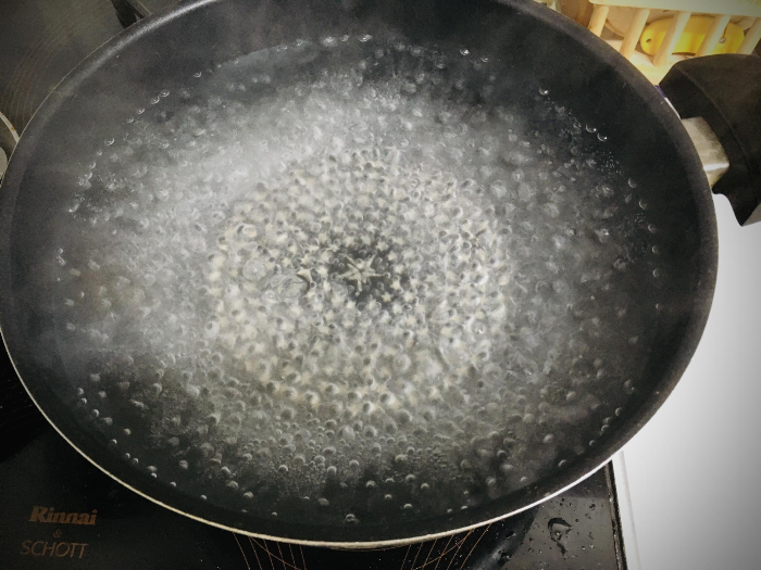 3. 찬물을 두컵반 정도(라면1개 기준) 부어줍니다.