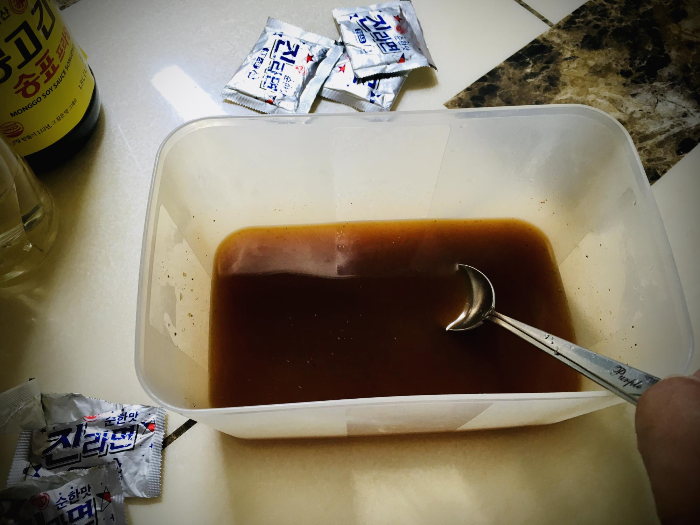 설탕2큰술, 라면스프1개, 간장2큰술, 식초2큰술 순서로 넣어주세요.