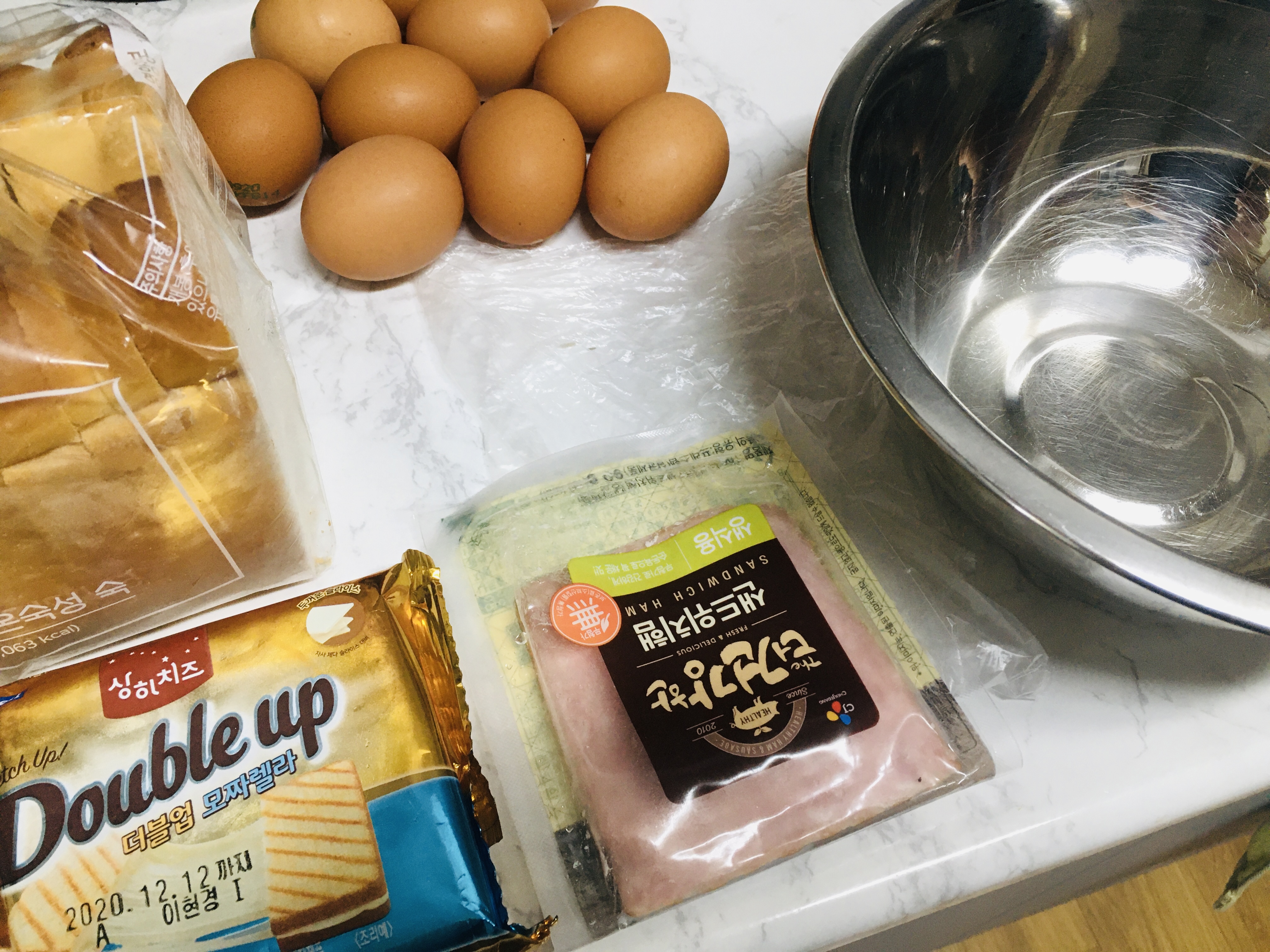 재료 : 식빵, 달걀, 베이컨, 치즈, 설탕, 소금