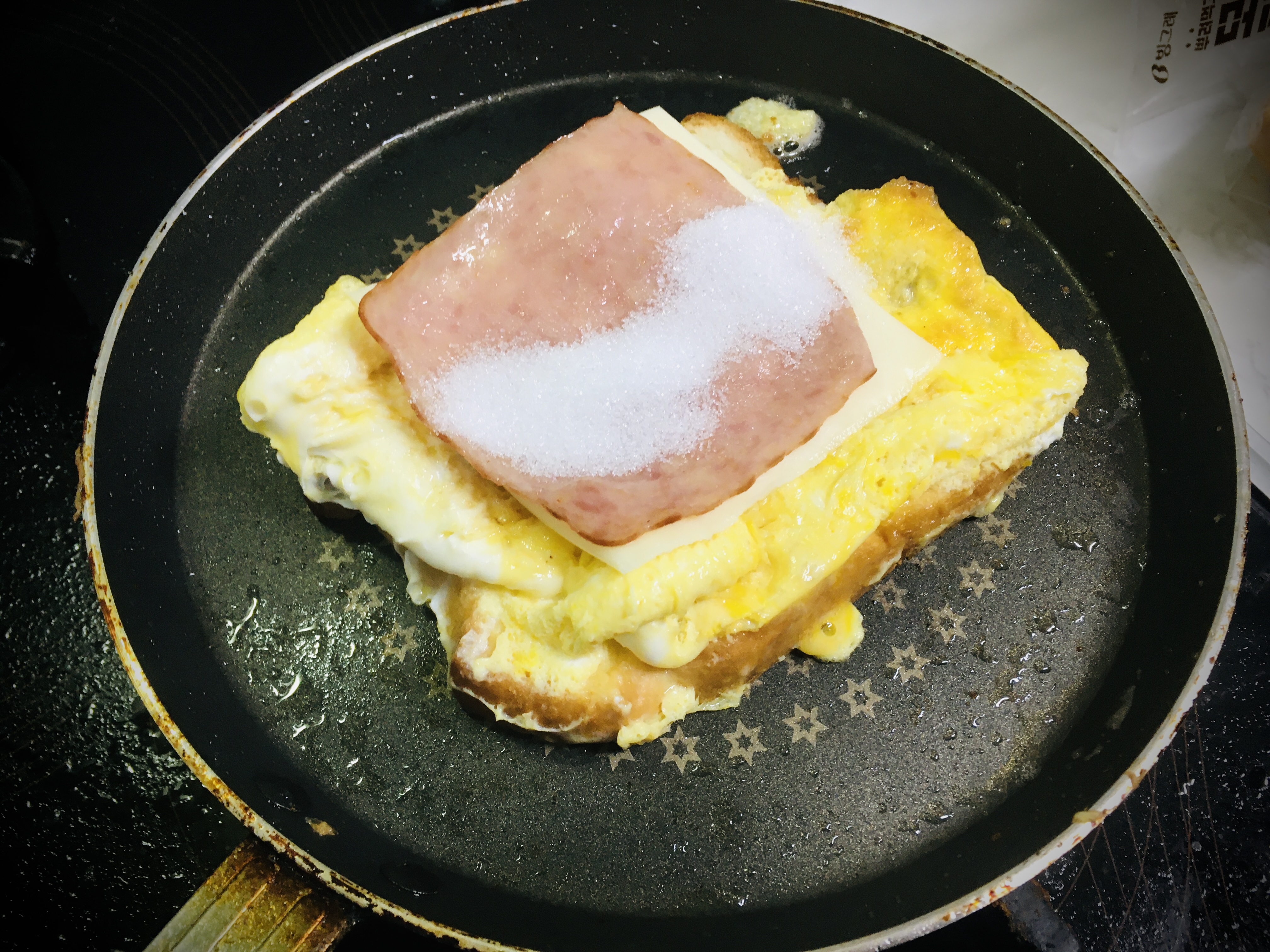 치즈, 베이컨, 설탕 듬뿍 넣고 반으로 접어주시면 완성