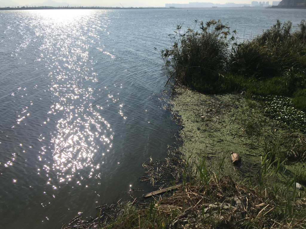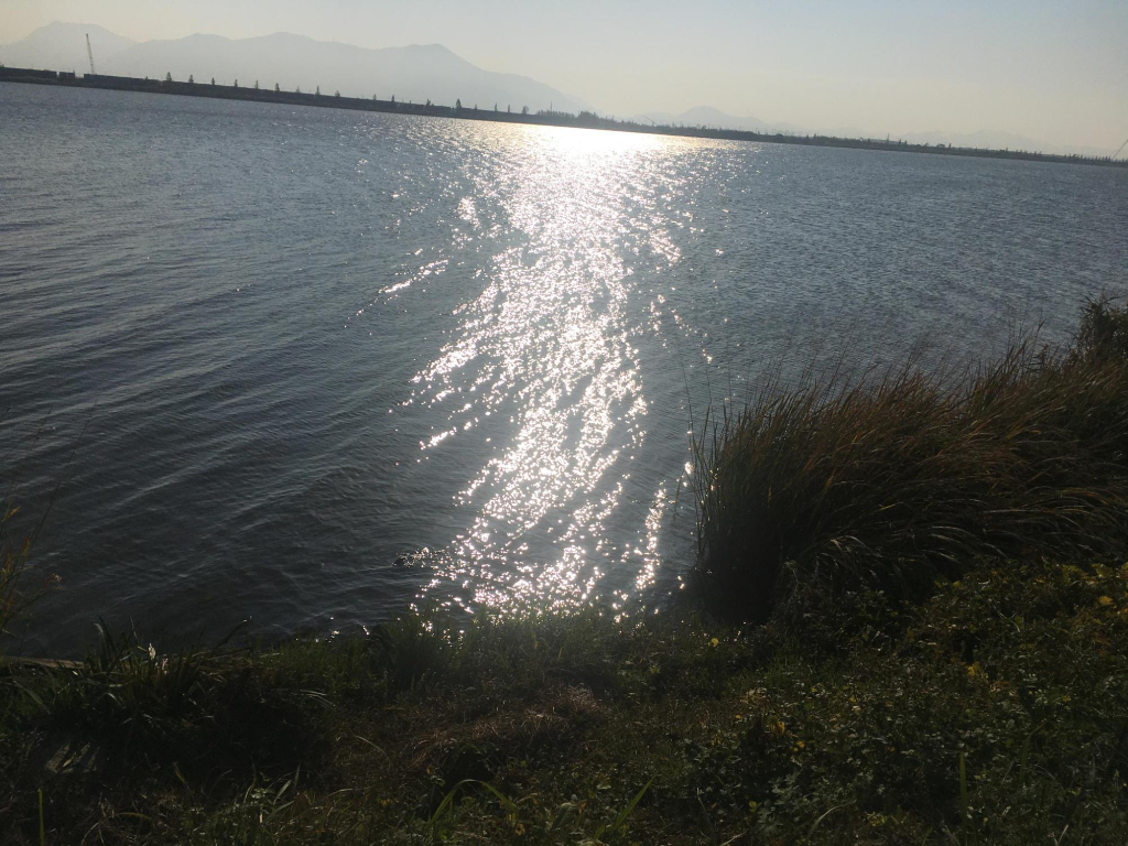 아침햇살이 수면에 가라앉아 부서지고 있습니다.