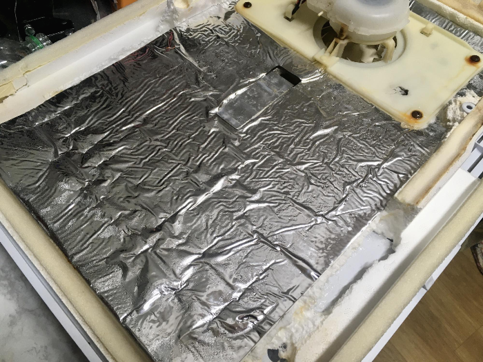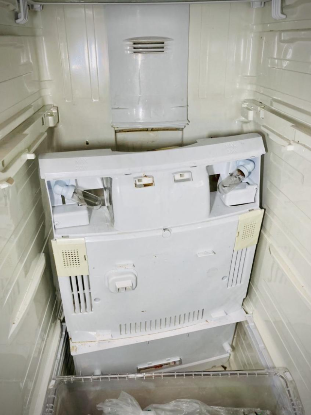 그런데 커버를 뜯어내고 봤더니, 아래쪽 테두리에 있는 스티로폼이 냉장고 뒷면에 달라붙어 부러져버렸습니다.