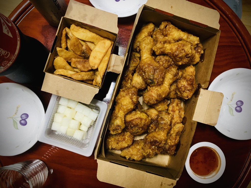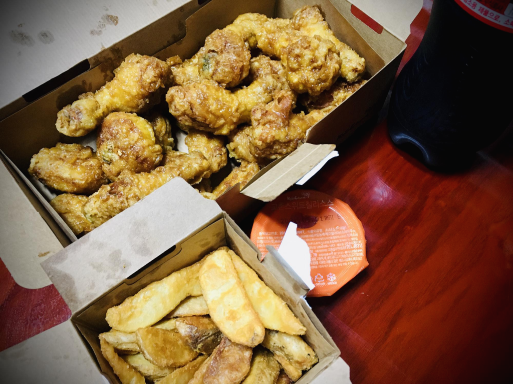 치킨은 튀김이 좀 딱딱한 편이었으며, 달콤한 허니소스라고 하는데