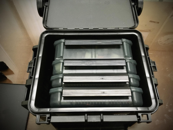 3010NDDM, 3010NDM, 3010ND, 3010NS 4개의 소품케이스를 세로로 수납한 모습입니다.
