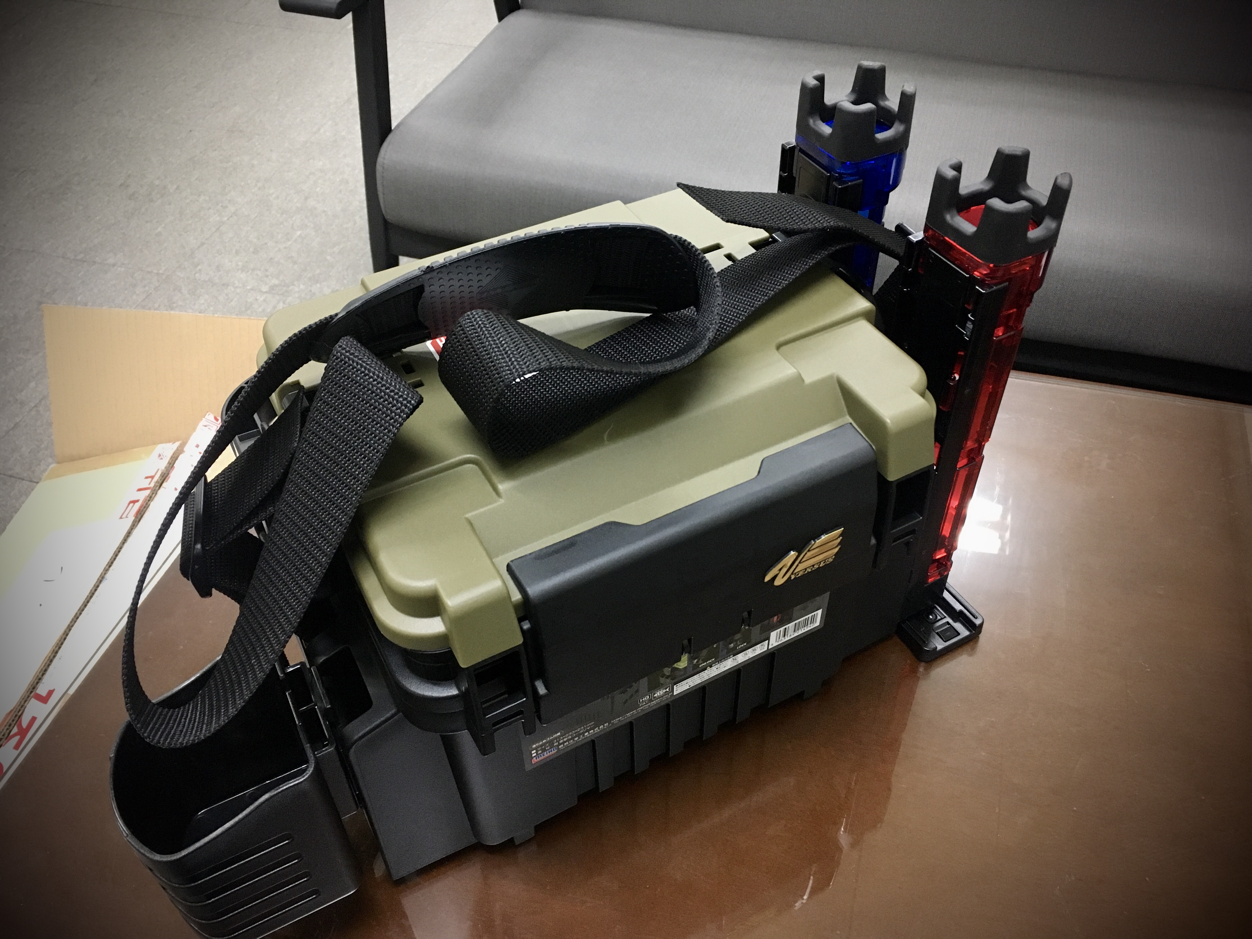 로드거치대 2개와 컵홀더, 어깨 벨트까지 부착한 7055N 태클박스 모습입니다.