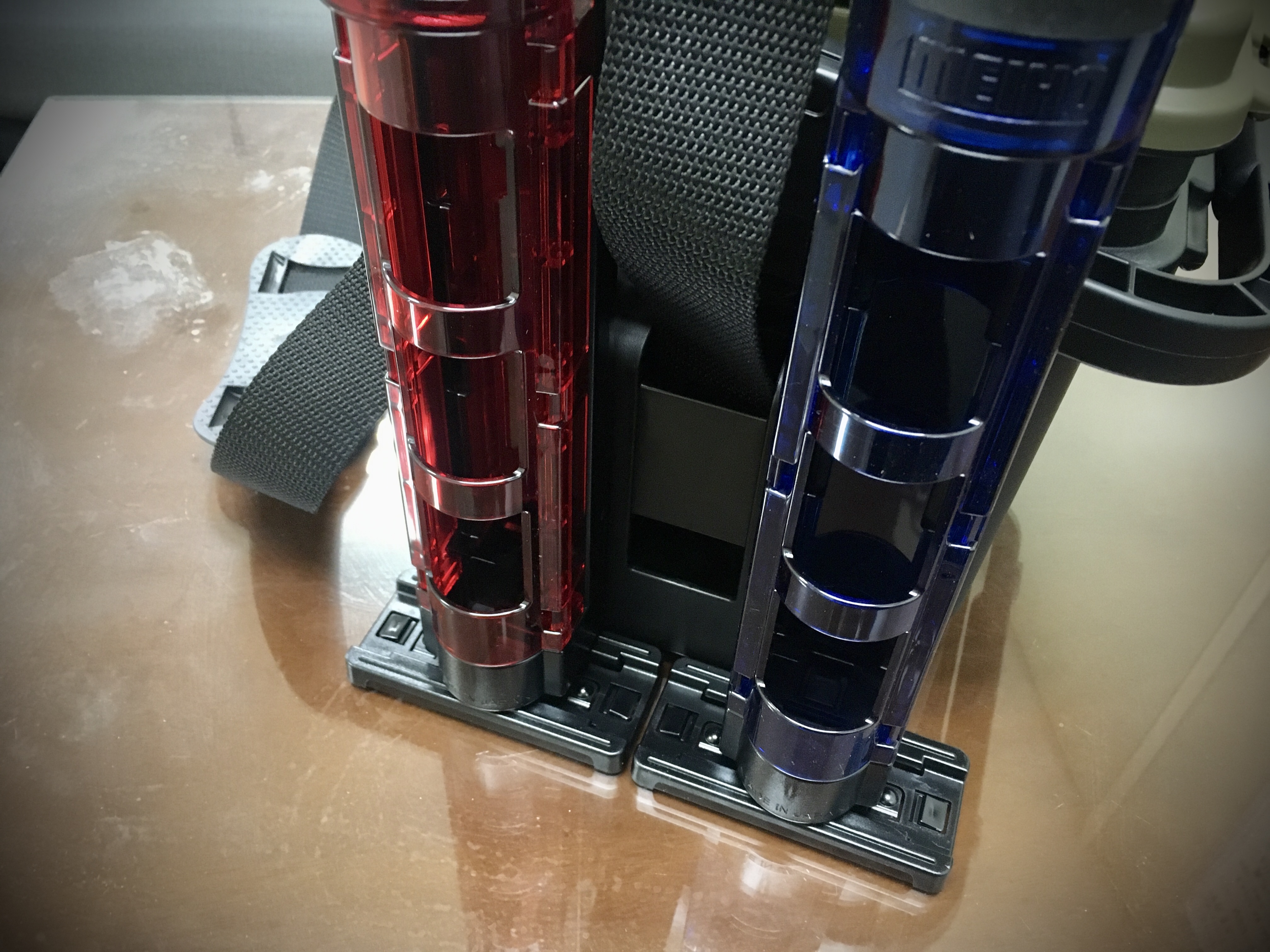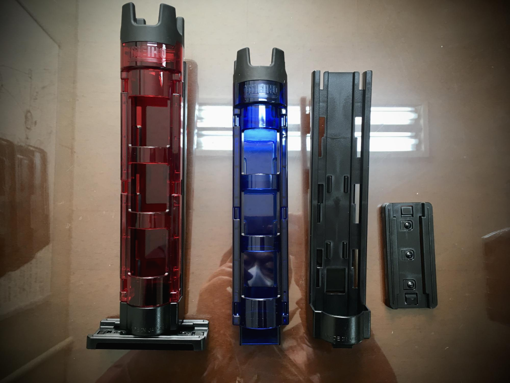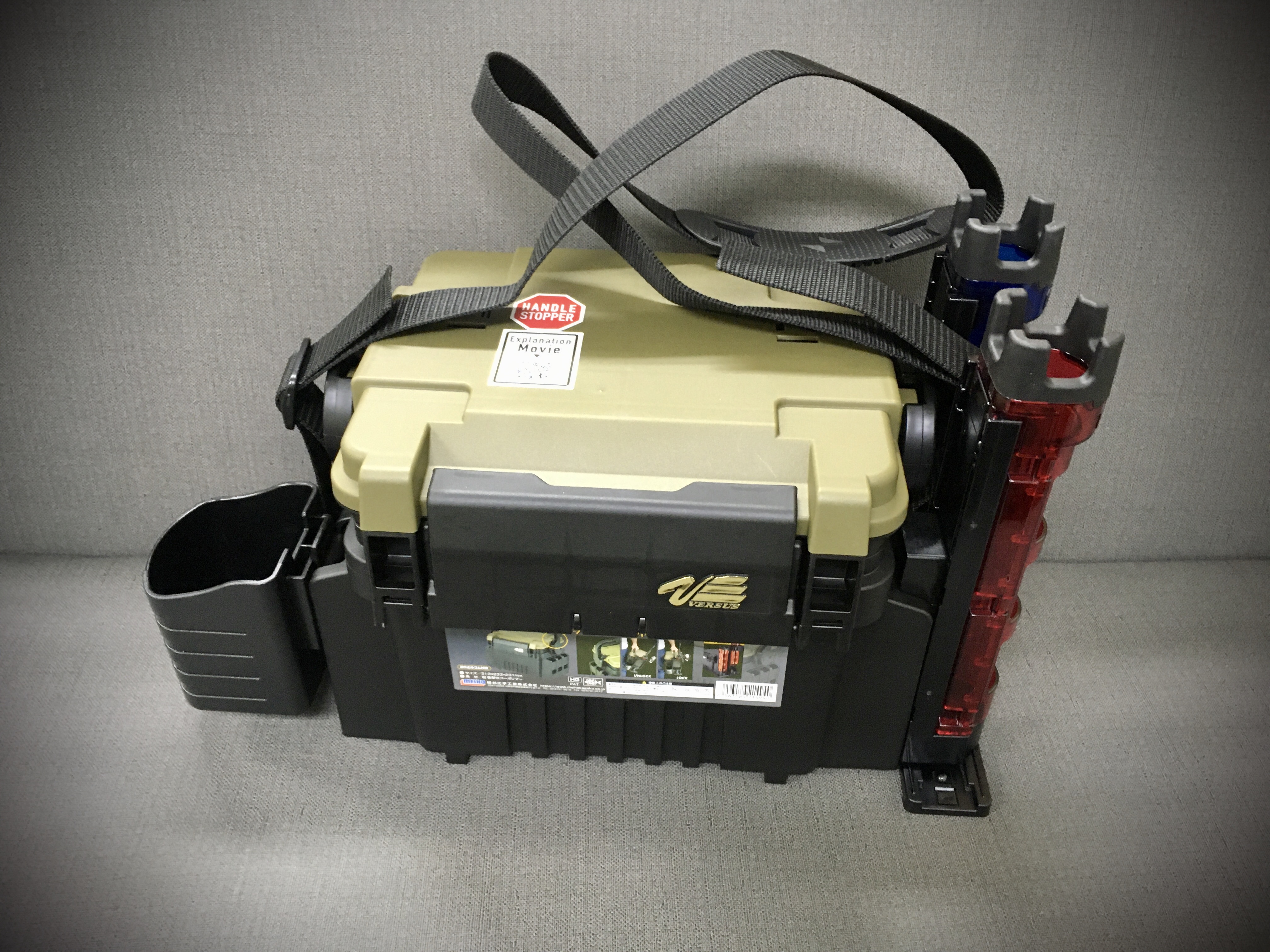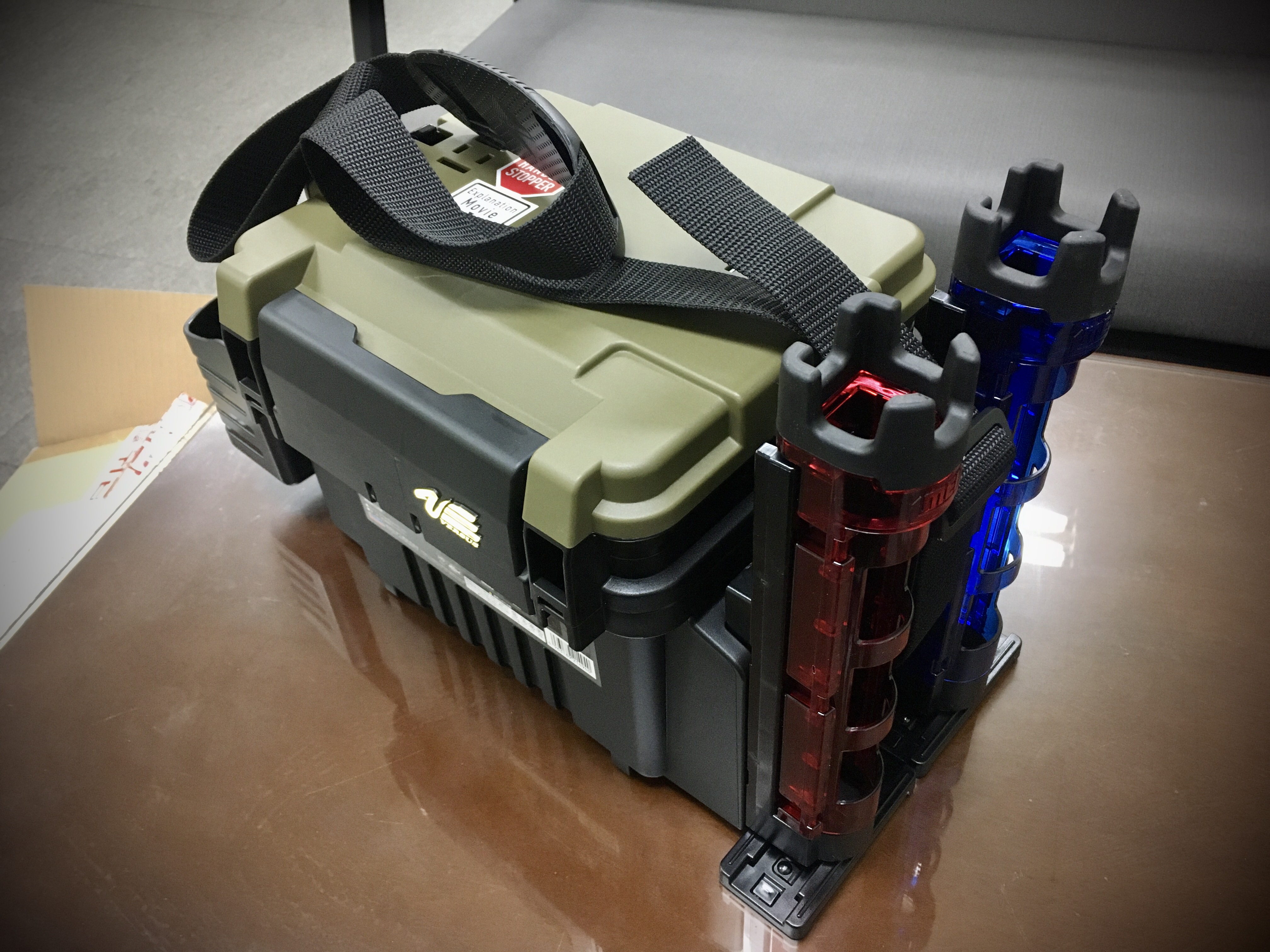 로드를 넣을 수 있는 파랑색 부분, 태클박스와 결합할 수 있는 부분, 바닥 받침 부분 3개의 부속으로 이루어져 있으며,