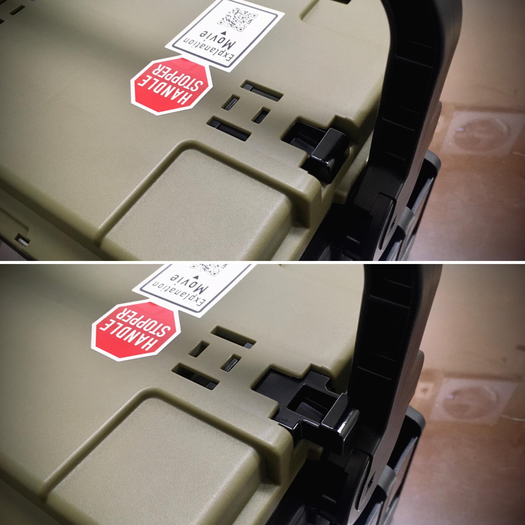 사용 방법은 저 까만 플라스틱을 몸체 바깥쪽으로 당겨주면 핸들이 돌아가지 못하도록 막아주는 역할을 합니다.