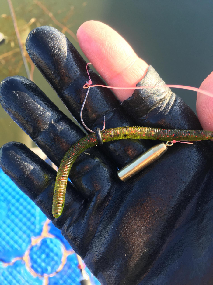 다운샷 채비에 웜은 와끼리그로 체결해서 발 앞에 내립니다.