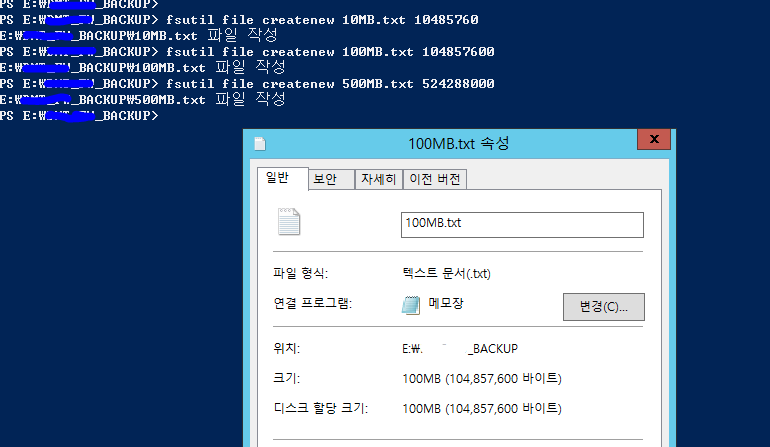 Windows (Server 포함) 아래 명령을 통해 특정 용량의 파일을 생성할 수 있습니다.