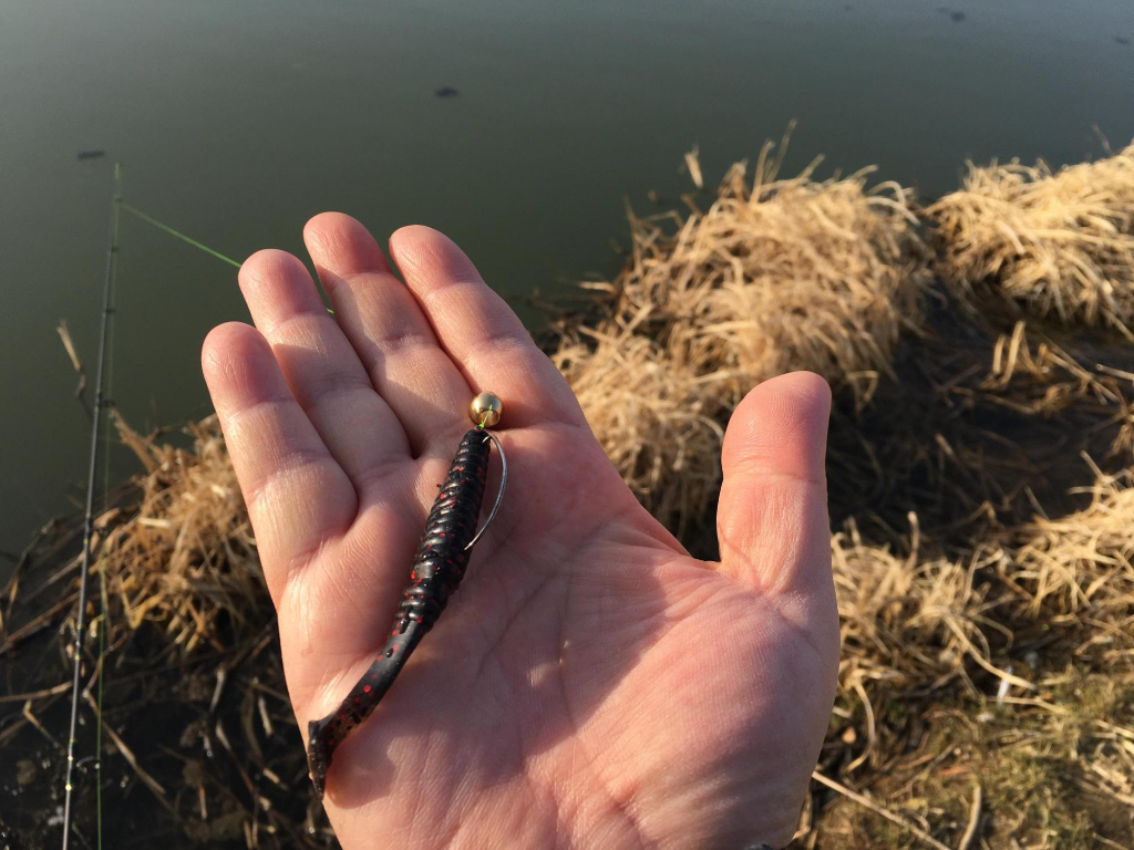 3인치 스태거 웜 노싱커에 1.2g 비드하나 꼽은