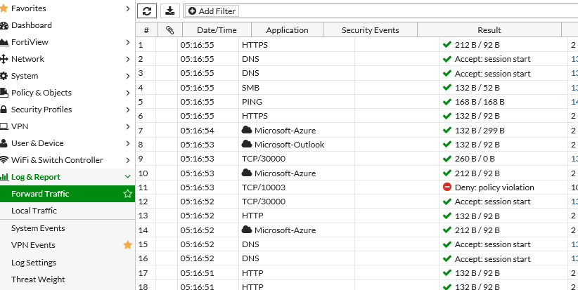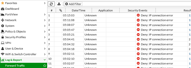 Fortigate > Log&Report > Forward Traffic 에서 Deny 관련 Log 만 확인되는 증상