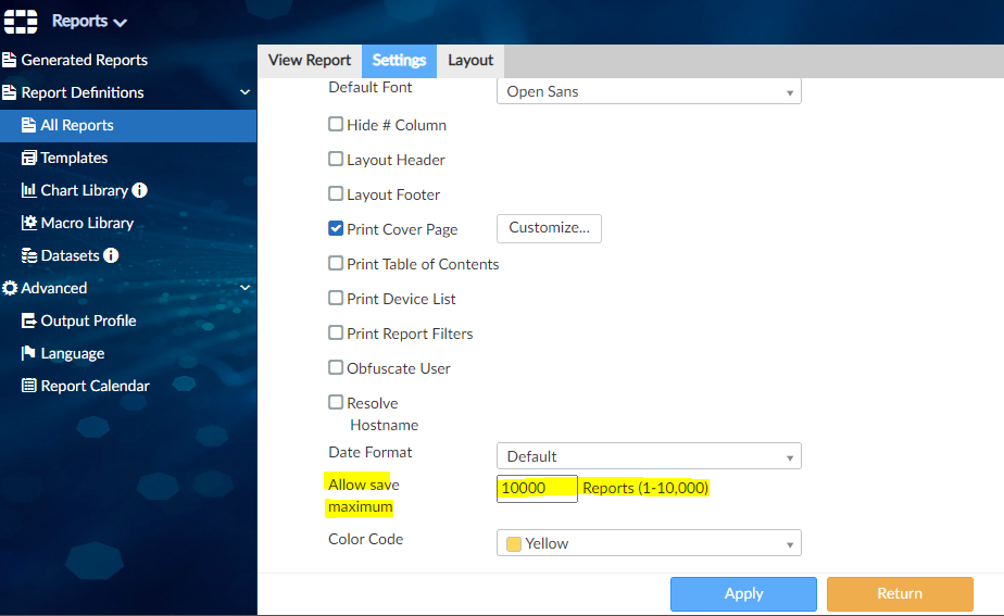i. All Reports > Settings > Advanced Settings > Allow save maximum (1 ~ 10,000)