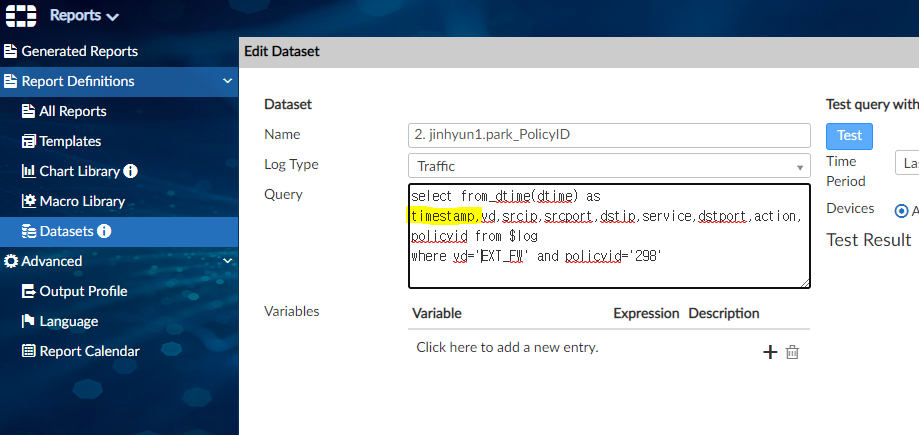 timestamp,vd,srcip,srcport,dstip,service,dstport,action,policyid from $log