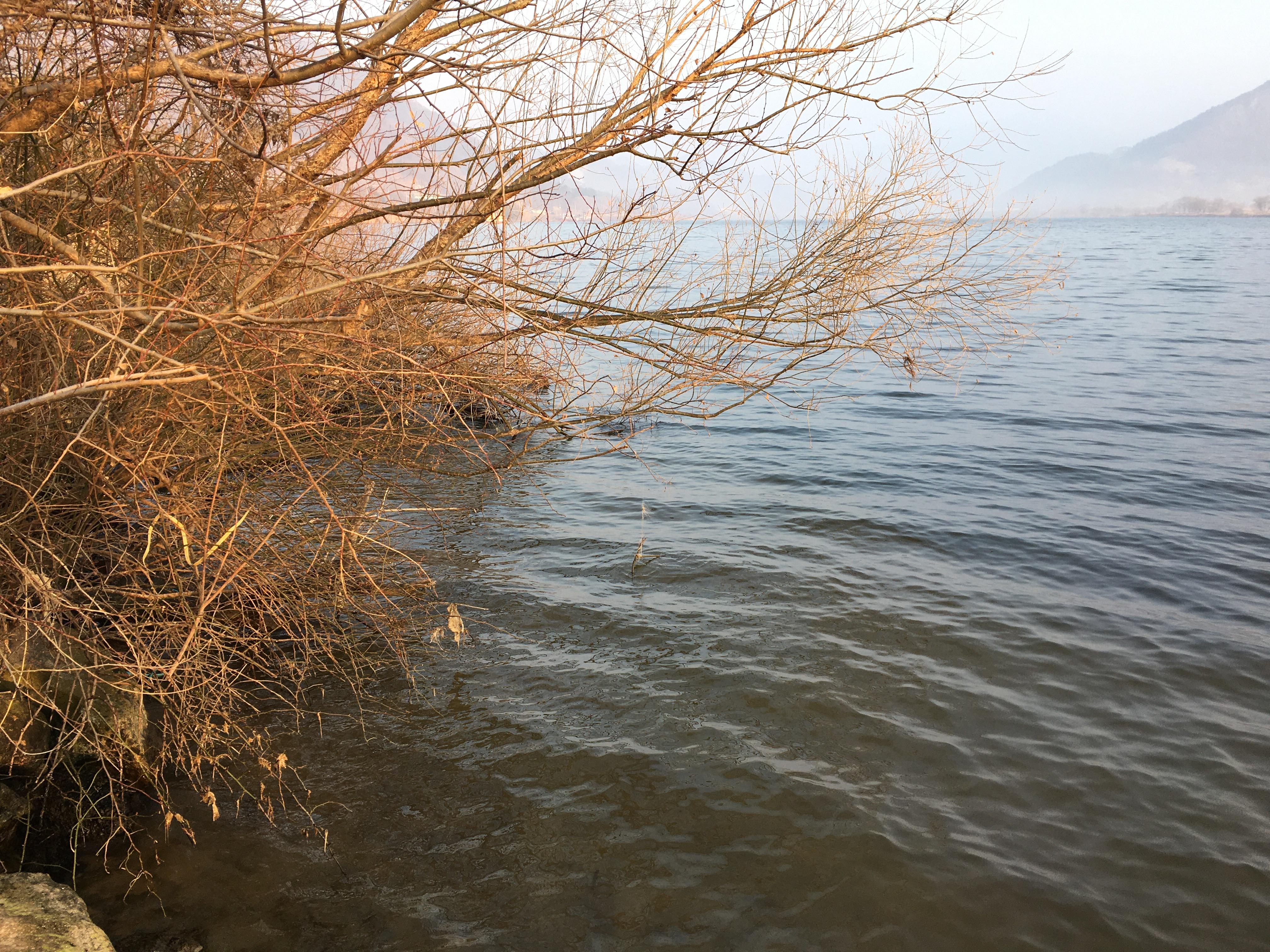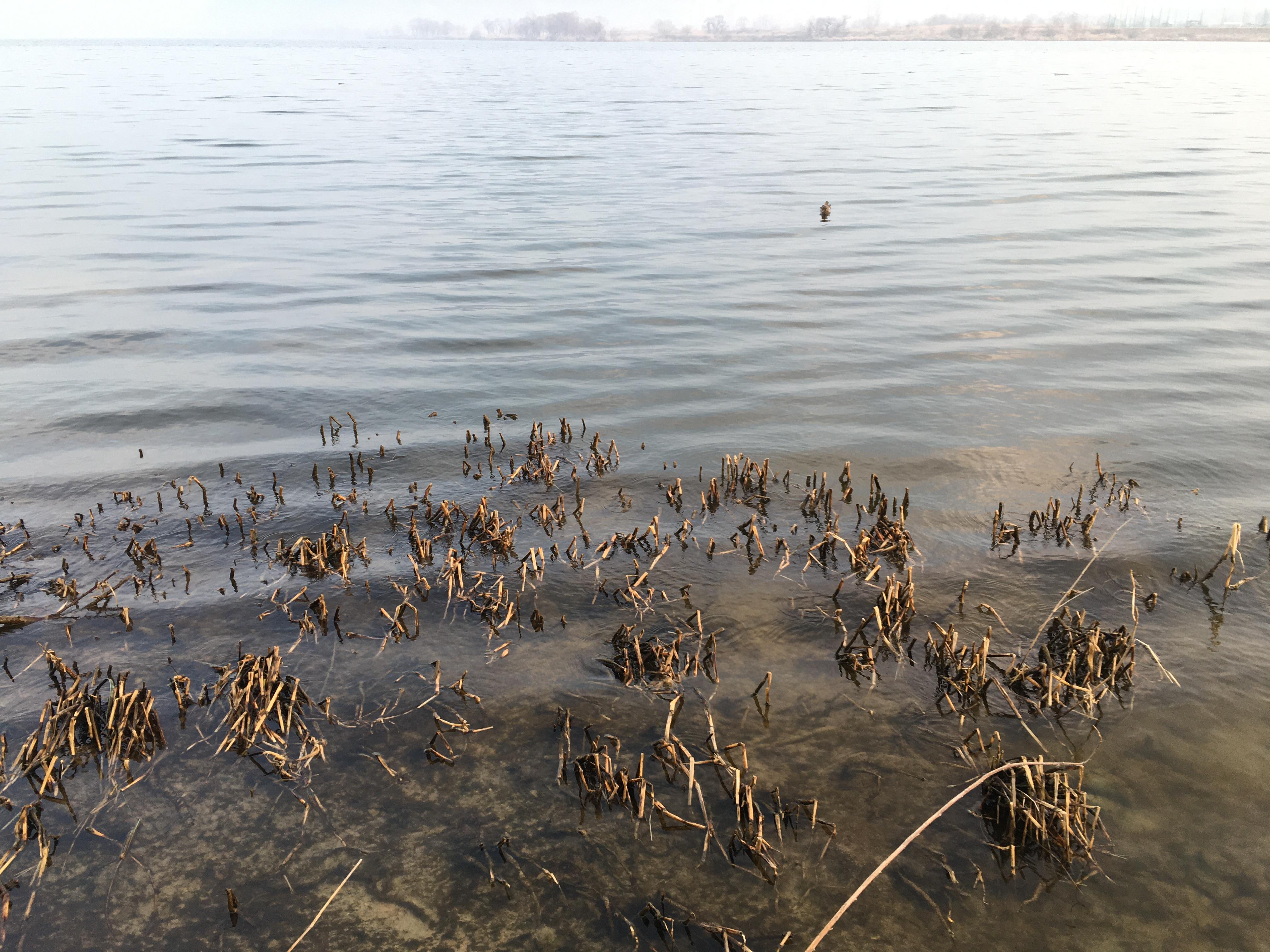 발 앞에 모래바닥에 듬성듬성 수초가 자라있고,