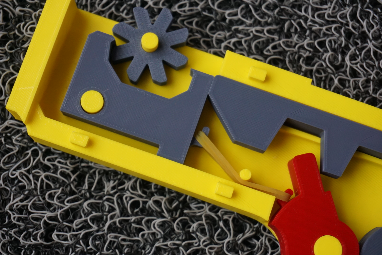 https://youtu.be/cM51nybSxkE This is a lever action rubber band gun that fires size-19, 1/16 rubber bands. Check the instructions.pdf file for info on printing and assembly. Primary hosting is on github at https://github.com/AVeryHappyTeddyBear/LeverAction