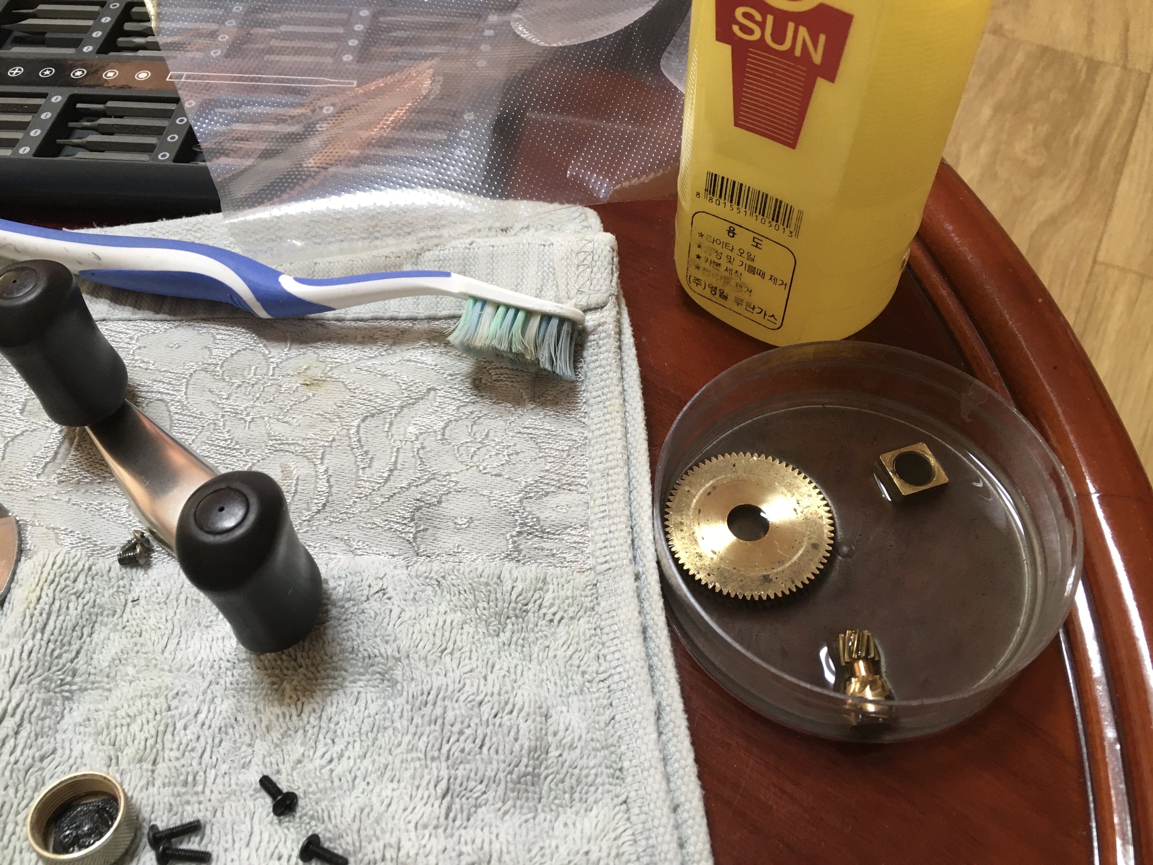 휘발유에 담궈서 살살 흔들고 굴려준 뒤, 칫솔로 쓱싹쓱싹 문질러 주었는데요.