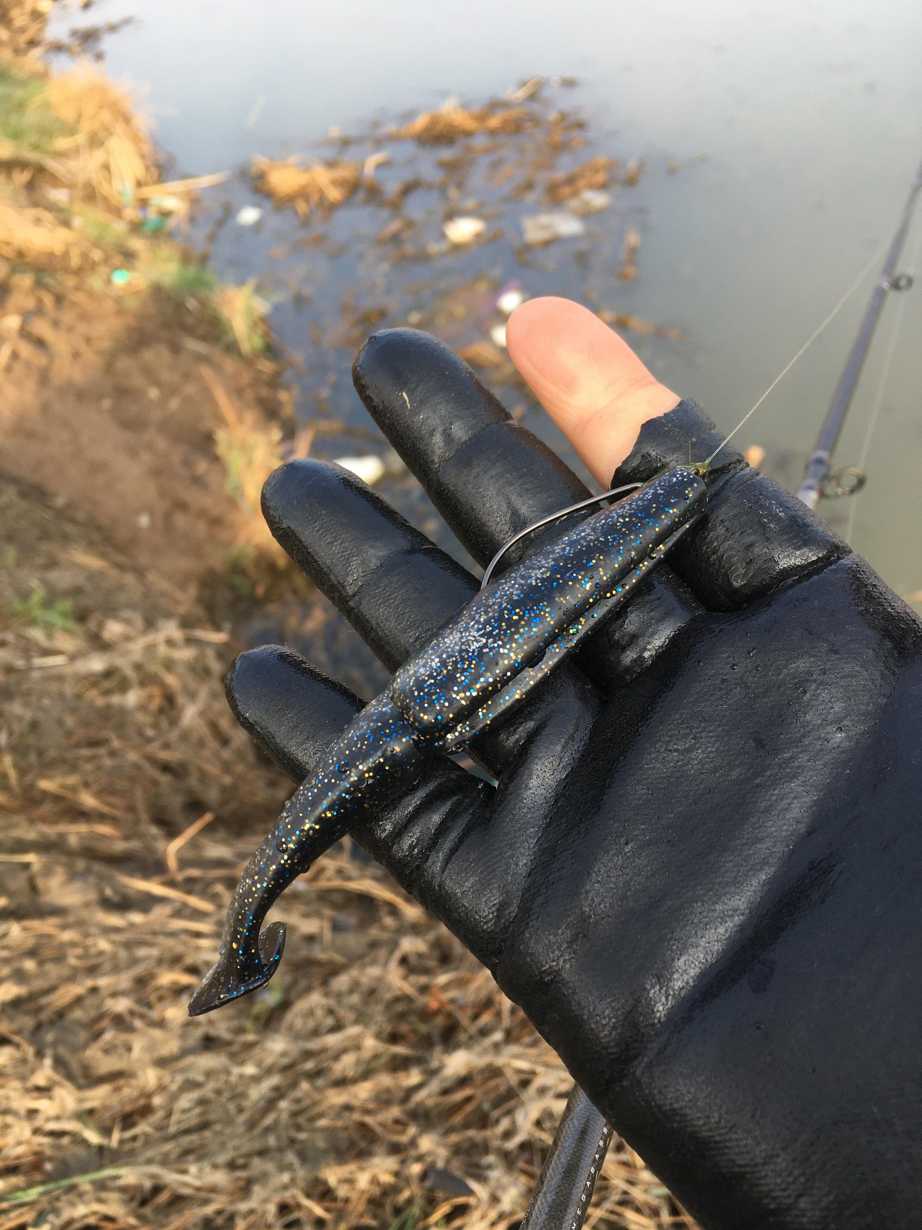 열정이 부족한 거 같고 뗏장 아래 숨어 있는 거 같아 과감하게 5인치 쉐드웜을 꺼내 들었습니다.