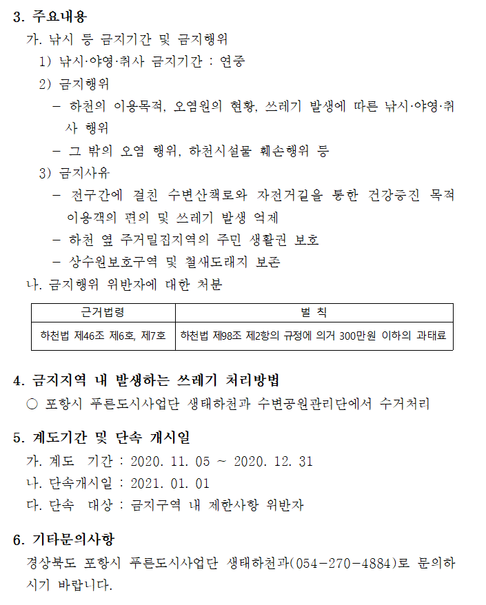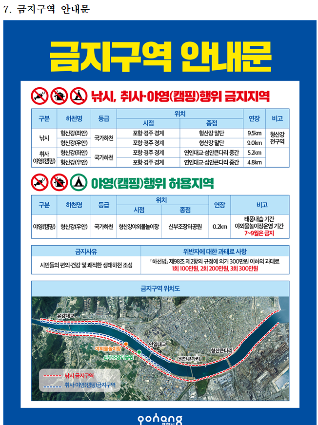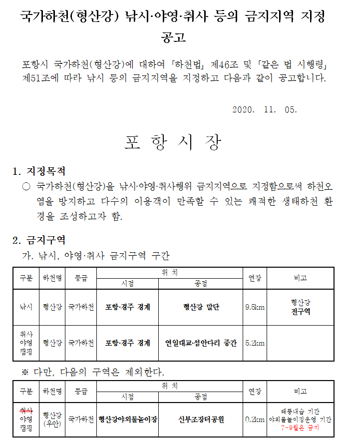 2021년 1월1일부터 개시되었으며, 포항시에 속한 형산강은 대부분 낚시.야영.취사 가 금지되었습니다.