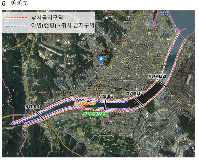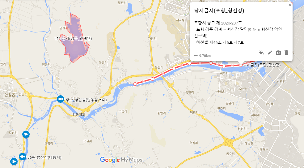 보시는 것처럼, 포항시 관할 형산강 양안 전체가 낚시 금지되었습니다.
